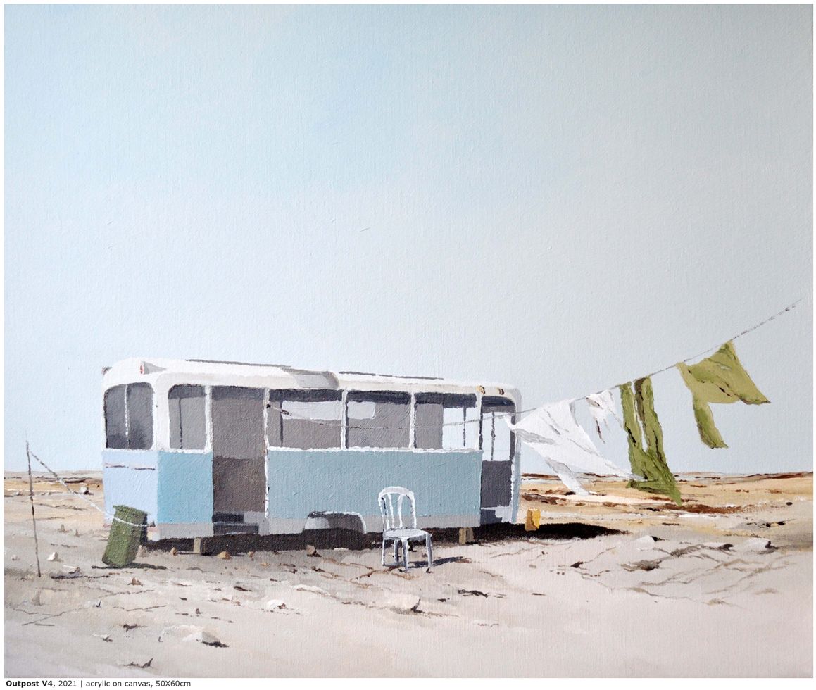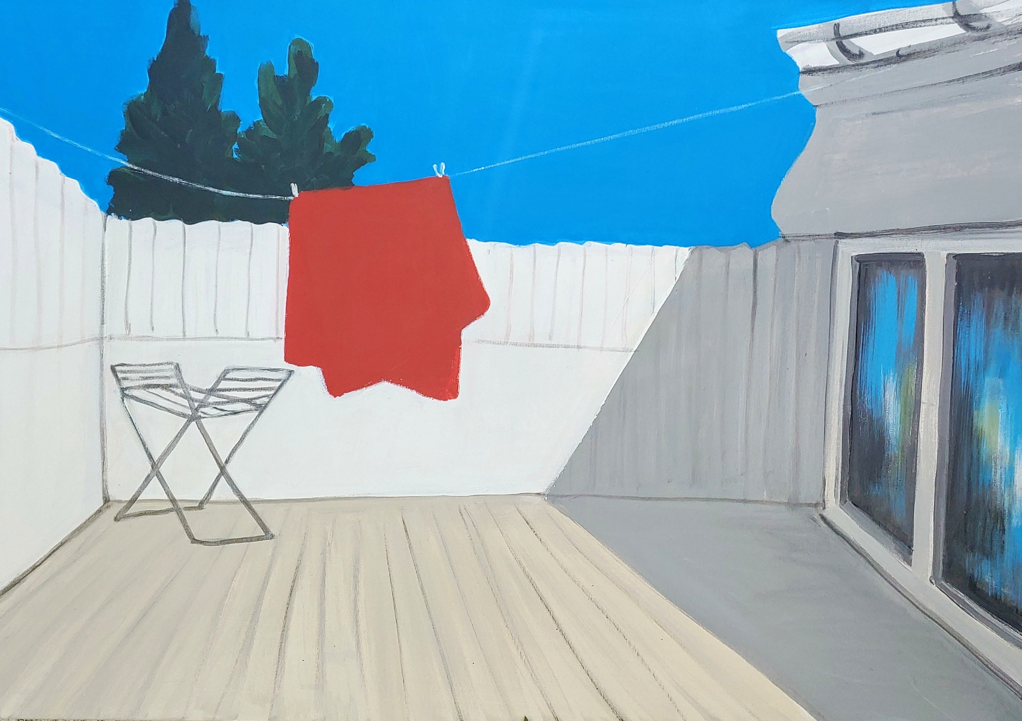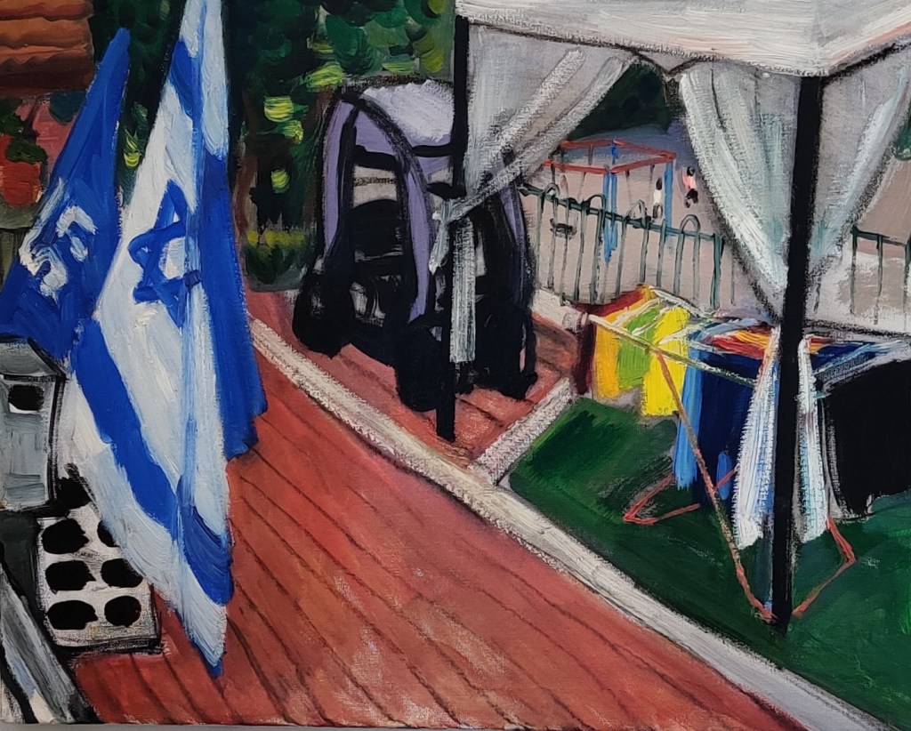 אולגה קונדינה המציגה עבודה שצוירה במרפסת בתל אביב, על חבל אחד מגבת אדומה של האמנית . בעבודה נוספת ערב רב של כבסים על מתקן כביסה דגל ישראל ופריטים נוספים בצד הצצה למגרש המשחקים, שורים להם יחדיו בעבודה המצוירת.