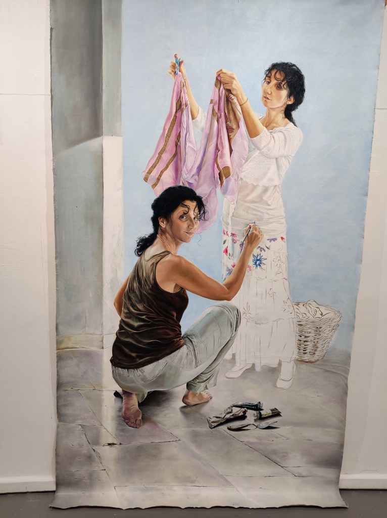 שירלי סיגל תלתה בחלל התערוכה את ציוריה על חבל עם אטבים. בעבודותיה מוצגים דיוקנאות של נשים בגילאים שונים, בין השאר "ונוס המזדקנת" וגם ציור עליו עמלה זמן ניכר, מציירת את עצמה תולה כביסה. הציור כפי שציינה לא גמור בדומה למלאכת הכביסה הלא נגמרת. וכפי שסיגל מציינת "פעם היה 'יום כביסה', בו נשים נפגשו ועבדו יחדיו. שילוב של חברותא בצד עבודה קשה".