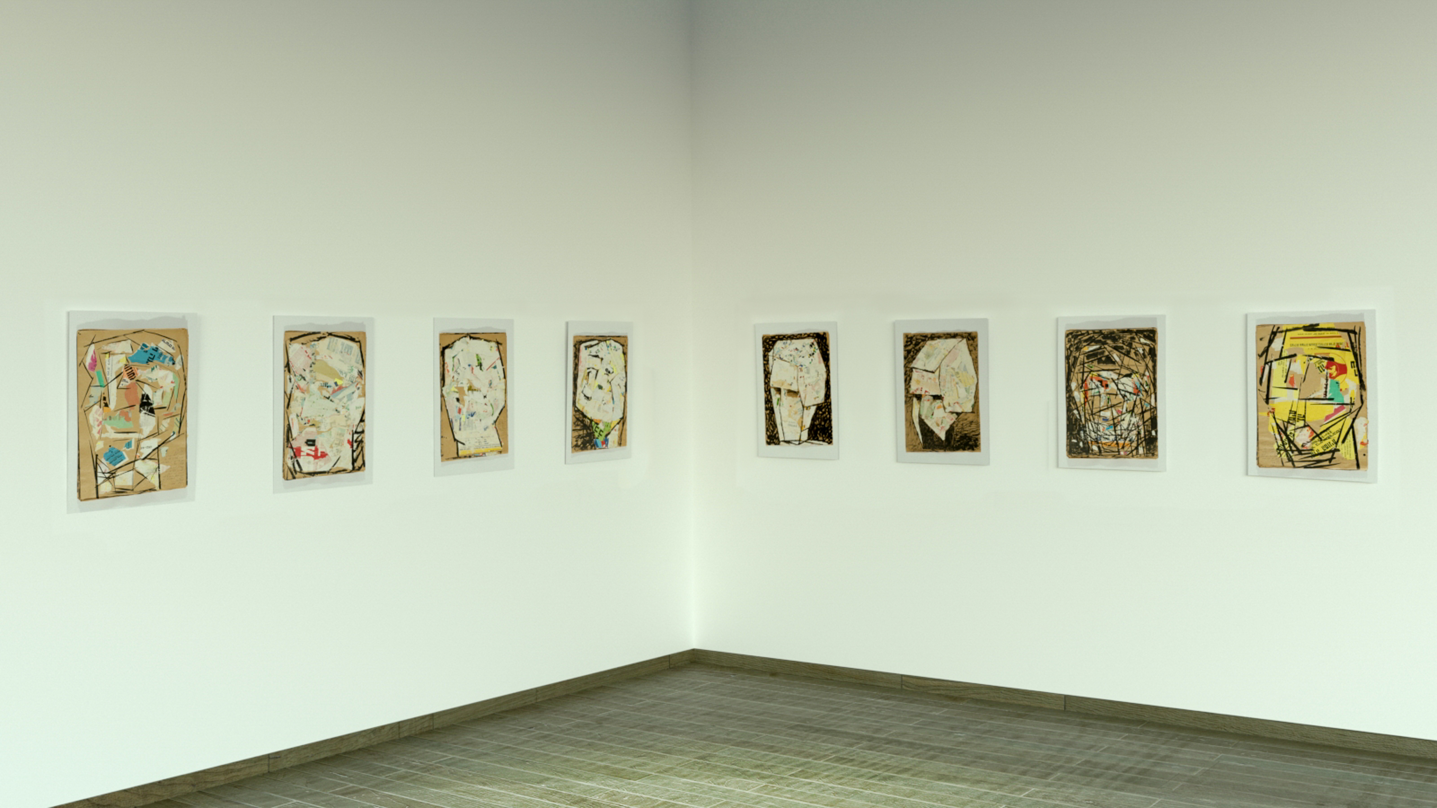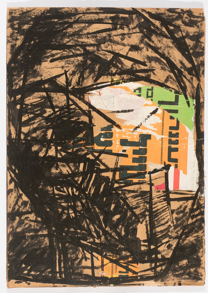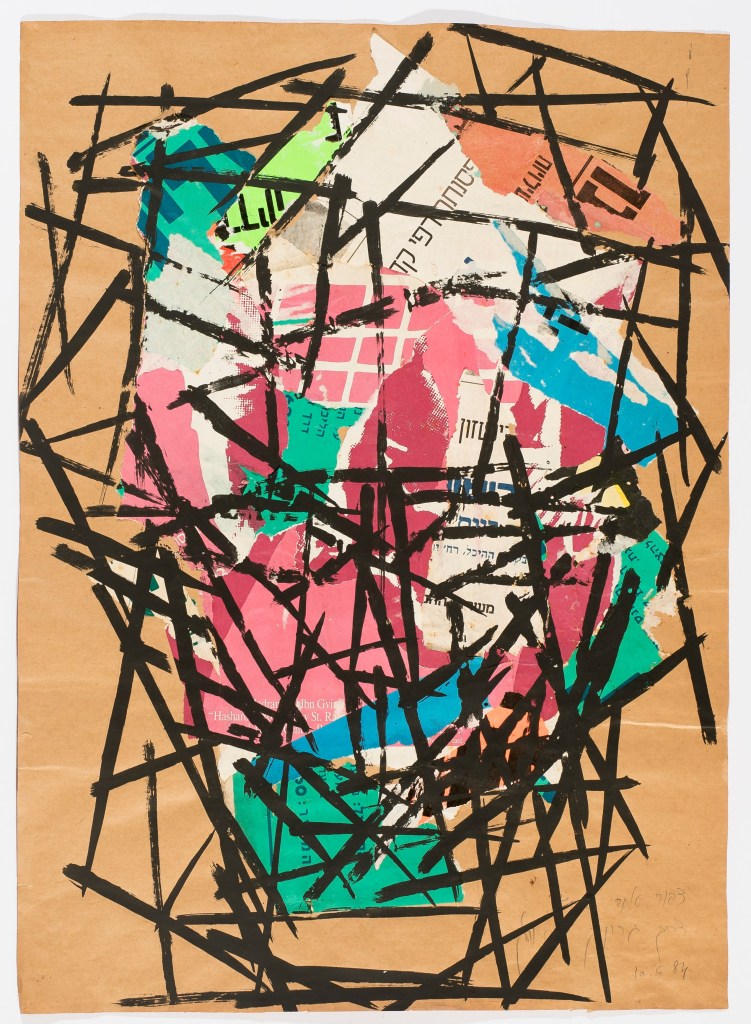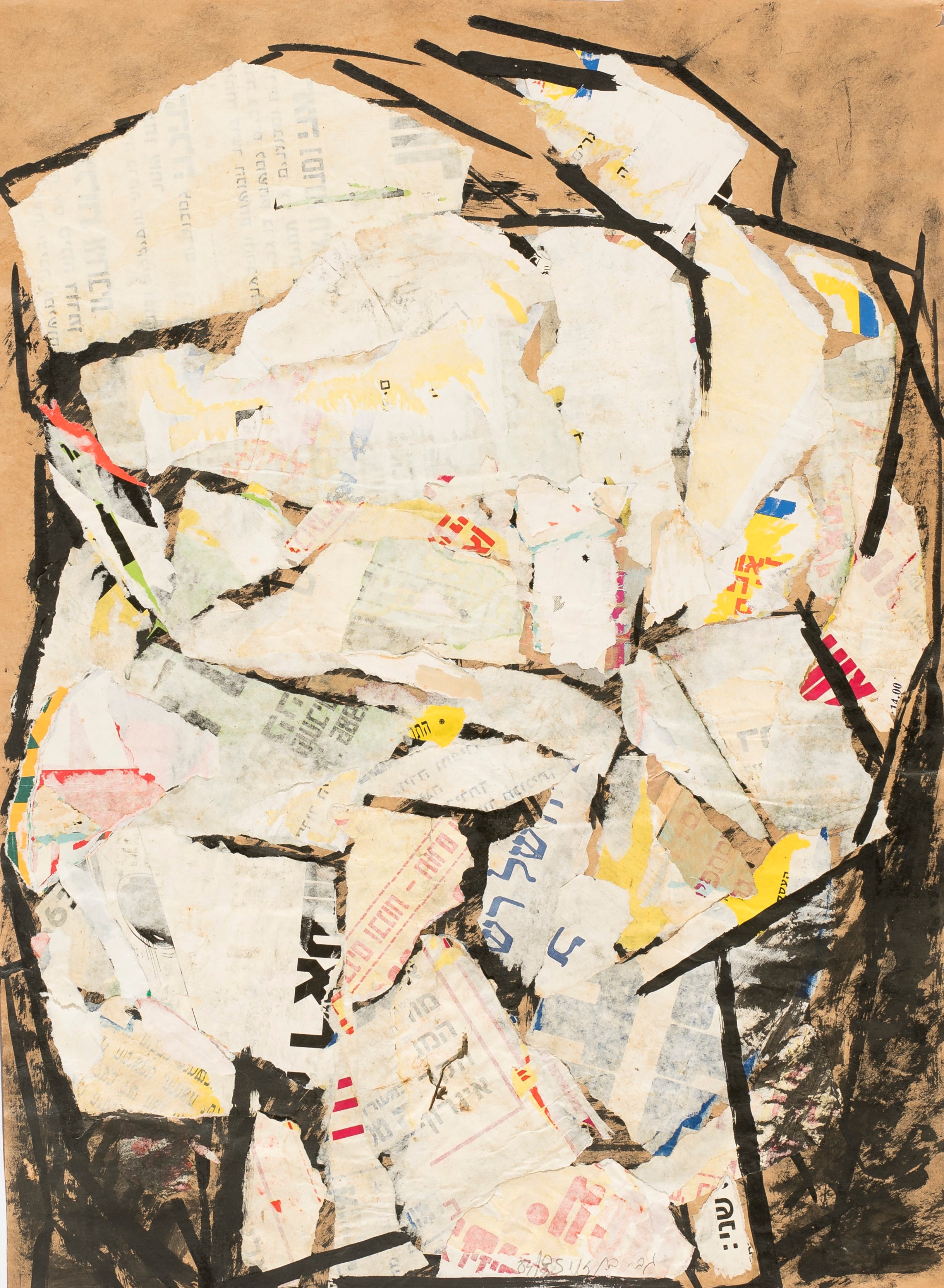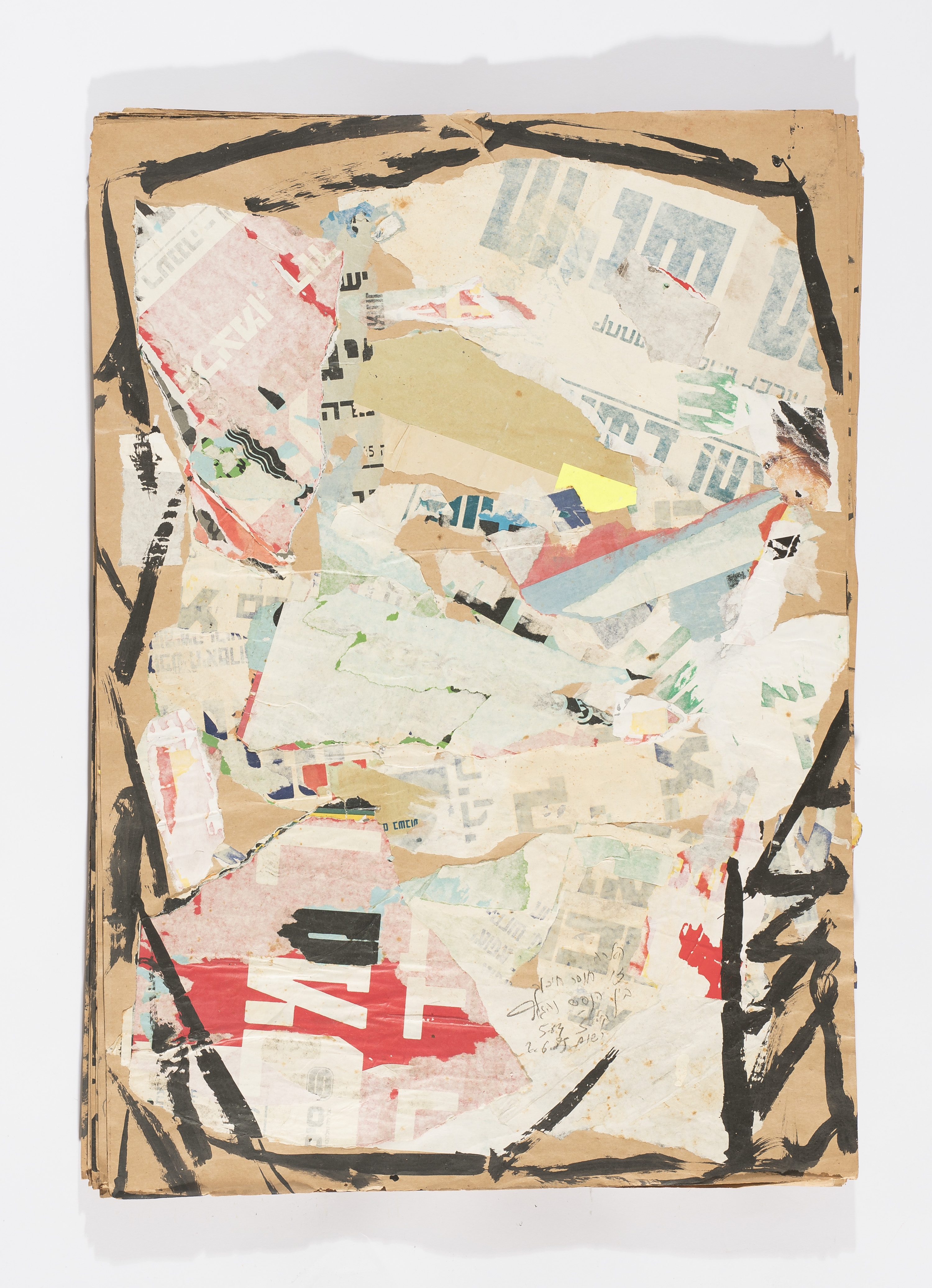 בדומה ניתן לומר זאת על עבודות הקולאז' בתערוכה –צורות לא מוגדרות בצד מוגדרות. במבט ראשון, העבודות נראות מופשטות, בהסתכלות נוספת אנו מגלים על פי רוב ראשים, חלקם קונקרטיים חלקם פחות. בן זנו תולש, קורע גזירי נייר ומודעות מלוחות ומשבץ אותם באי-סדר המקבל בסופו של דבר משהו מובנה, לרוב דמוי פורטרט. יש כאן מן האגירה ואפשר שגם מן המיון? הצורות מצטברות זו על זה וכנגד זו ומסתירות את הבסיס, וגורמות לנו לתהות מהו הרקע ומהו האימז', משחק צבעים – בהיר וכהה, צבעוני וכדומה. קו שחור, כתמי צבע שחור ועוד.
