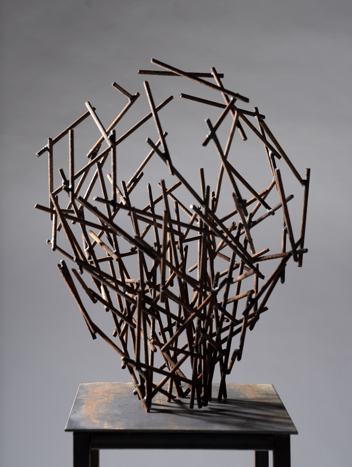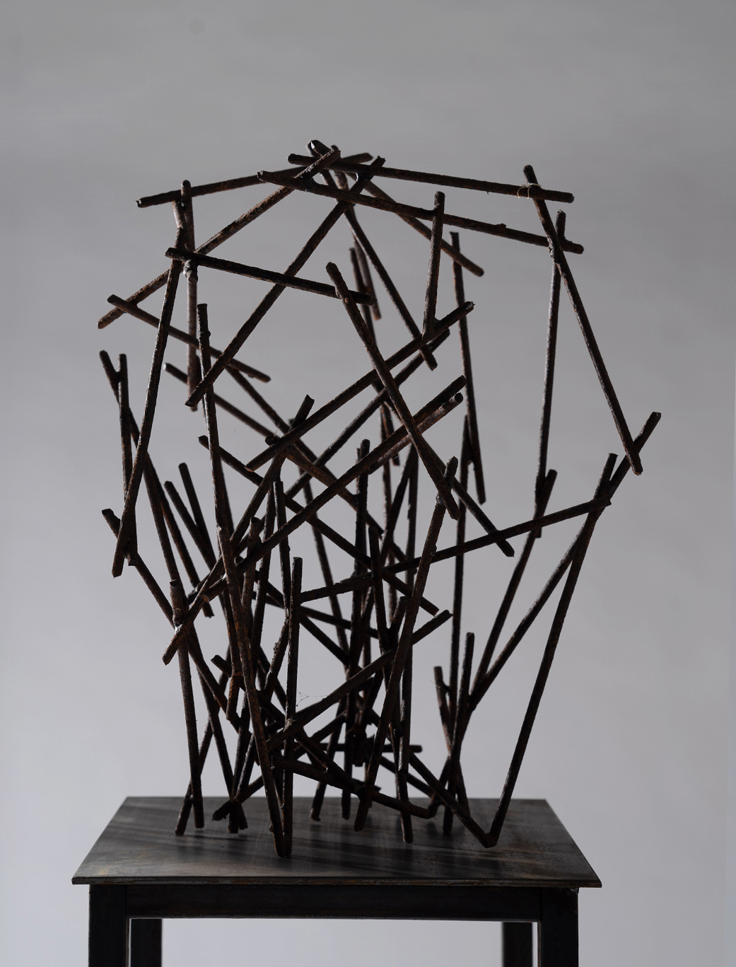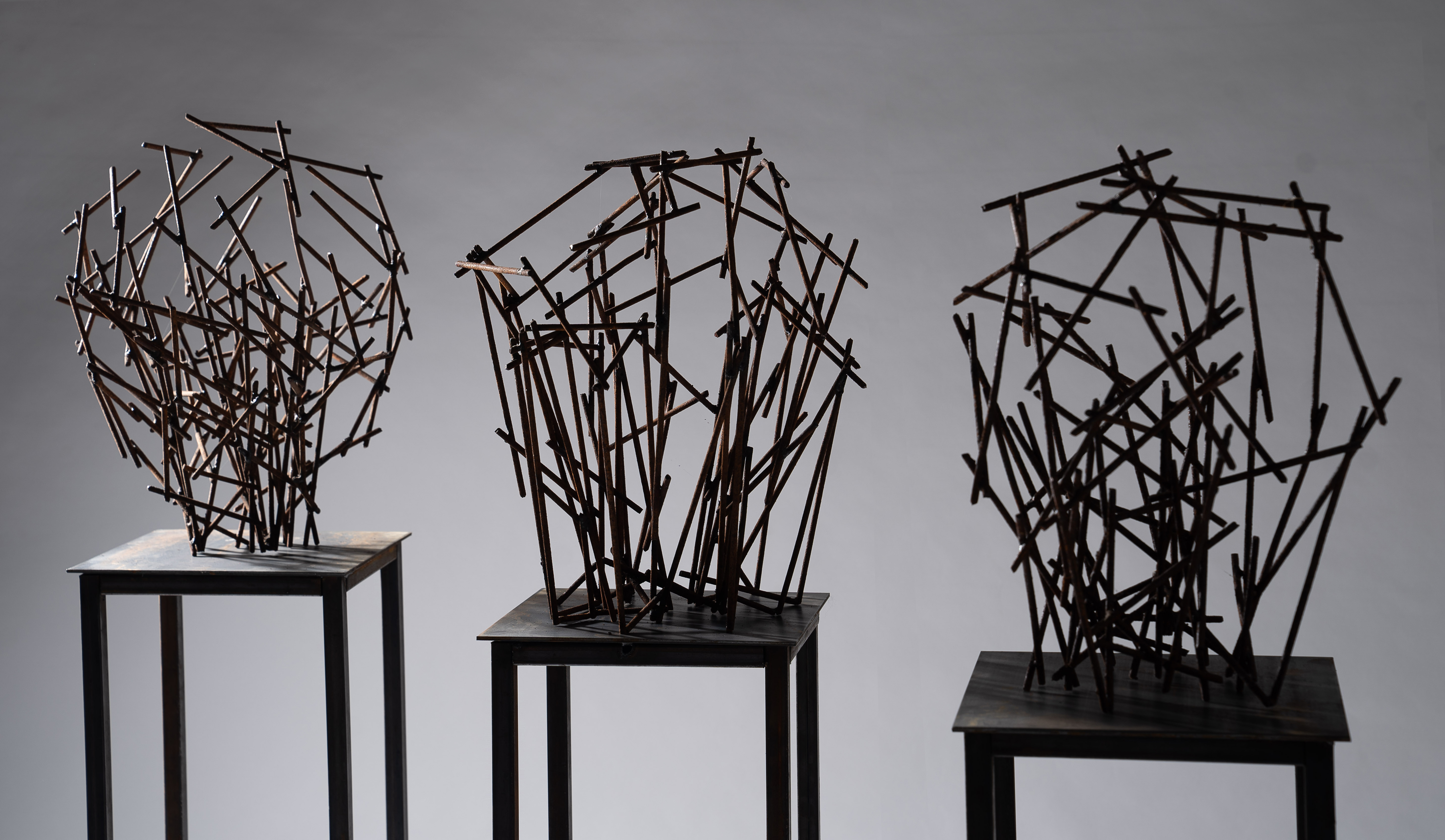 חומרים מצויים, הריק המוקף על ידי הקווים הוא החלל של היצירה. הפסלים הינם סטטיים, תחושת התנועה נוצרת בשל הקווים המוצגים באופנים שונים – תחושה של ציור בחלל.