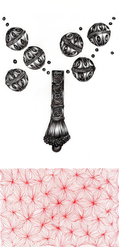 רות כהן מציגה לראשונה דגמים פרי יצירתה כמעט מדי יום במהלך שלושים השנה האחרונות. רות יוצרת כמעט מידי יום ציורים מלבניים קטנים ועליהם דגמים צבעוניים חוזרים, מדויקים, צפופים, המהדהדים לעבודותיה של אסתר.  בצד האחורי של הדפים היא מציינת אירוע, אישי או ציבורי, המשיק ליום בו יצרה את העבודה, מעין יומן או מֵּמוֹרַנְדּוּם שתחילתו בשנות ה-90 והמשכו עד היום. העבודות נעשו על שאריות דפים שנחתכו במכונת דפוס בהוצאת הספרים "יבנה" בה עבדה שנים רבות. בעבודותיה חוברים יחדיו הדים וזיכרון הספרים שהוצאו לאור בהוצאה זו בצד המילים והאירועים השונים. צורת עבודה זו מהדהדת לעבודתה של אסתר כהן, הבת. באחת השיחות עמה סיפרה אסתר על כך שהוצאת הספרים "יבנה", הוציאה בין השאר לאור את המהדורה העברית של "אטלס לתלמיד". בתקופת החגים עובדי החברה קבלו במתנה שי לעובד- מארז ספרים חדשים. את המתנה נהגו לעטוף בדרך כלל בגיליונות "פגומים" של אטלס לתלמיד, שנפסלו בתהליך הדפוס. כילדה, אסתר נהגה לשמור את "ניירות העטיפה" המיוחדים וכך החל למעשה אוסף המפות שלה, הממשיך עד היום כתהליך אמנותי המלווה בתהליכי מחקר ארוכים ובאוסף אטלסים במהדורות מיוחדות בערבית ובאנגלית ורישומים על מפות מקוריות ישנות אשר חלקן נדירות ביותר. בעבודות אלו התמקדה אסתר כהן בעבר, בציור/רישום של פרחי בושם, כגון לבונה, קציעה ושיבולת נרד ופרחי בר מקומיים (המוזכרים בתפילה "פיטום הקטורת"), בשילוב רישום מפורט של תכשיטי פיליגרן מסורתיים. בתערוכה זו ממשיכה אסתר בציור תכשיטים וקמעות של יהדות תימן לצד צמחים ופרטים של טבע או צורפות. וכך אם ובת מאחדות כוחות ביצירה שיש בה מן העבר וההווה, והתכתבות.