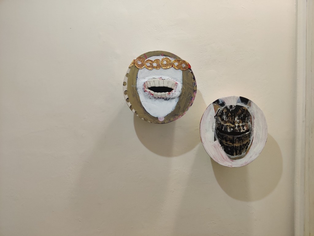 העבודות המוצגות בחללי הגלריה על הקמרונות שבהם והתאים הקטנים המאפשרים הצגה של יצירה אחת נבחרת מנהלות "דיאלוג" מעניין עם המקום. העבודות בגדלים שונים על מצע נייר (בחלקה התחתון של הגלריה) מקבלות הדהוד נאה ביותר בקירות שנצבעו בחלקם התחתון בצבע תכול, אותו צבע שיש בו מתכול השמיים אך גם הדהוד לעבודותיה הטעונות בסממנים מיסטיים. צבע התכלת מלא במשמעויות; בימים עברו היה סממן של מלוכה, קדושה וייצוג של שמימיות. בעדות מסוימות צבע זה נתפס כצבע שיש בו אפשרויות הגנה כנגד "עין הרע".