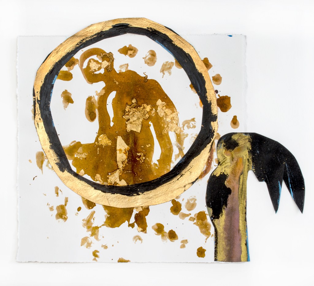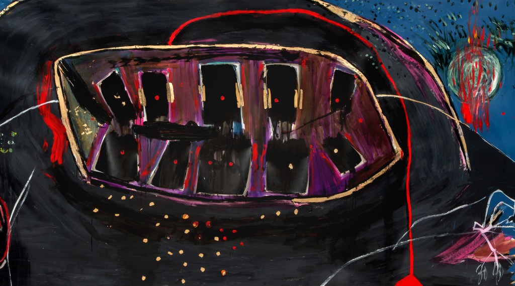 קווים אדומים, חוצצים, מוחקים ולעתים זולגים מופעים בין כתמי השחור העז, הנפתח לעתים כמניפה, ולעתים "מטפטפים" מטה, במעין אזכור לעבודות מהמודרניזם ולמחוות היד ב-action painting בן המאה העשרים. ביניהם עולים ריצודי זהב ויוצרים קומפוזיציה שיש בה עזות בצד "מיתון". הזהב המסמל מלכות שמיים כשם שעושר חומרי/ארצי מופיע כעיטור אבקה ועטיפות זהובות של מטבעות שוקולד בצלחות הקרמיקה המעוגלות.