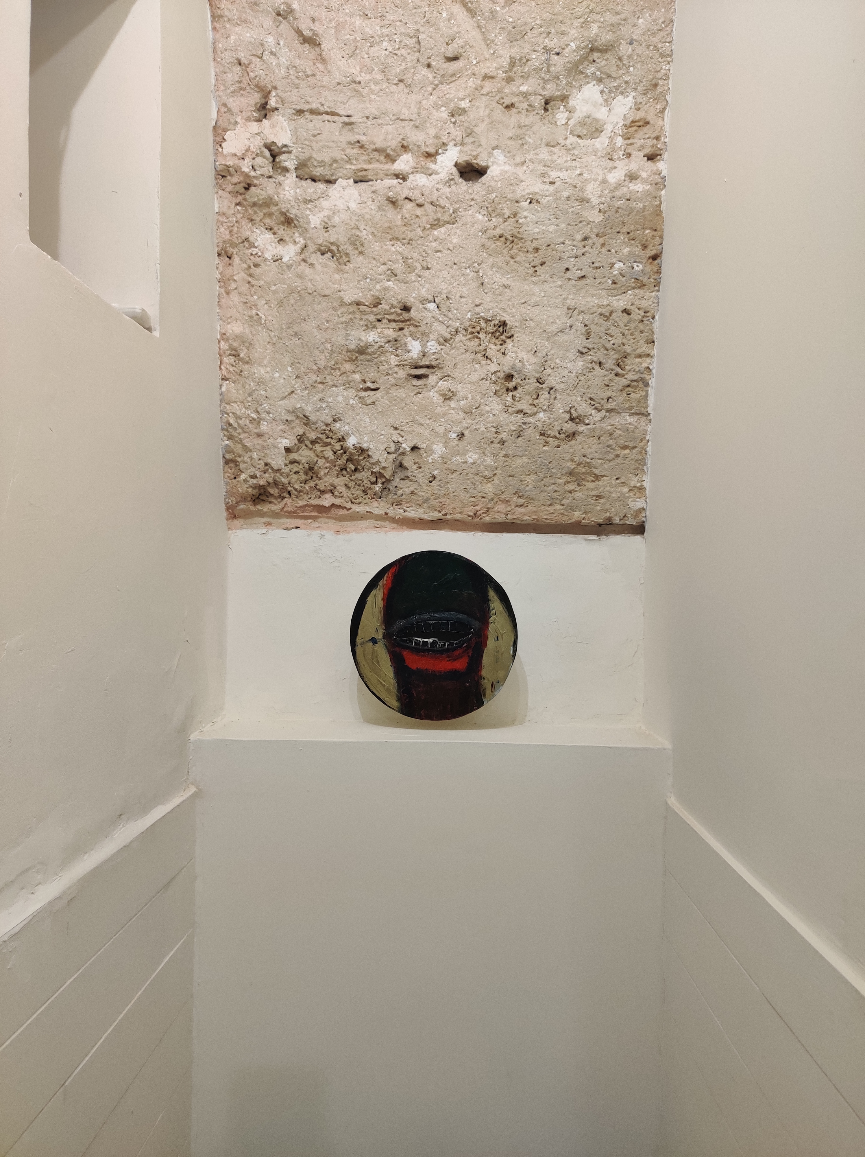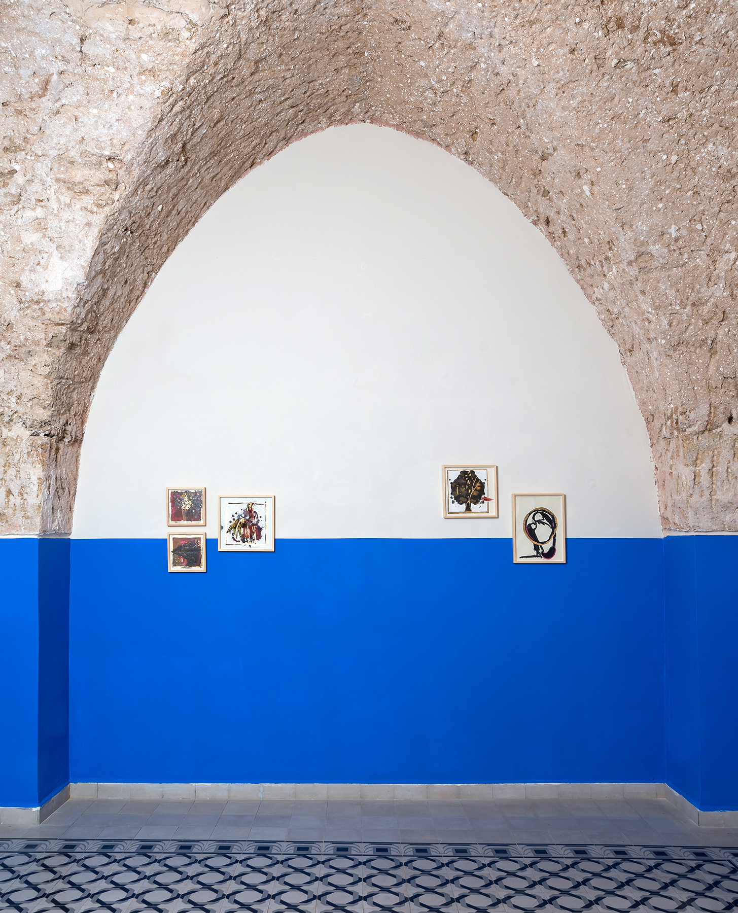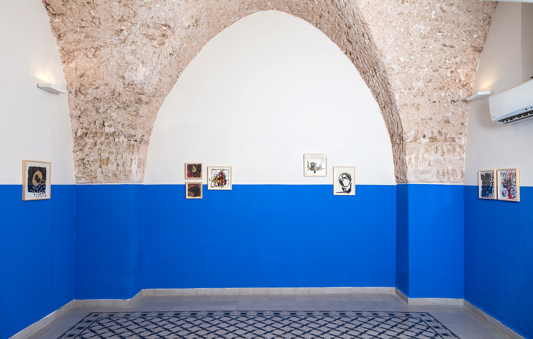 העבודות המוצגות בחללי הגלריה על הקמרונות שבהם והתאים הקטנים המאפשרים הצגה של יצירה אחת נבחרת מנהלות "דיאלוג" מעניין עם המקום. העבודות בגדלים שונים על מצע נייר (בחלקה התחתון של הגלריה) מקבלות הדהוד נאה ביותר בקירות שנצבעו בחלקם התחתון בצבע תכול, אותו צבע שיש בו מתכול השמיים אך גם הדהוד לעבודותיה הטעונות בסממנים מיסטיים. צבע התכלת מלא במשמעויות; בימים עברו היה סממן של מלוכה, קדושה וייצוג של שמימיות. בעדות מסוימות צבע זה נתפס כצבע שיש בו אפשרויות הגנה כנגד "עין הרע".