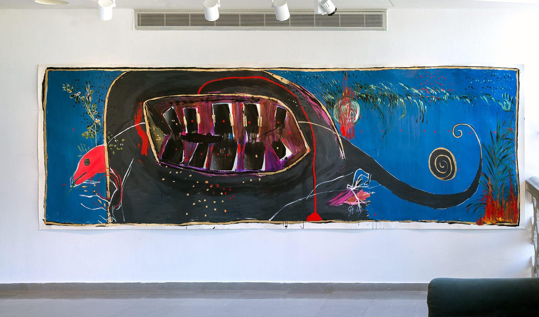 בחלל העליון של הגלריה מופיע דימוי הזיקית הזוחלת מלוא גופה לאורכו של ציור על מצע נייר גדול ממדים. הזיקית הנתפסת בתרבויות שונות כמבטיחה שפע ומזל טוב מכבירה מטובה ברכה על התערוכה והבאים בשעריה.