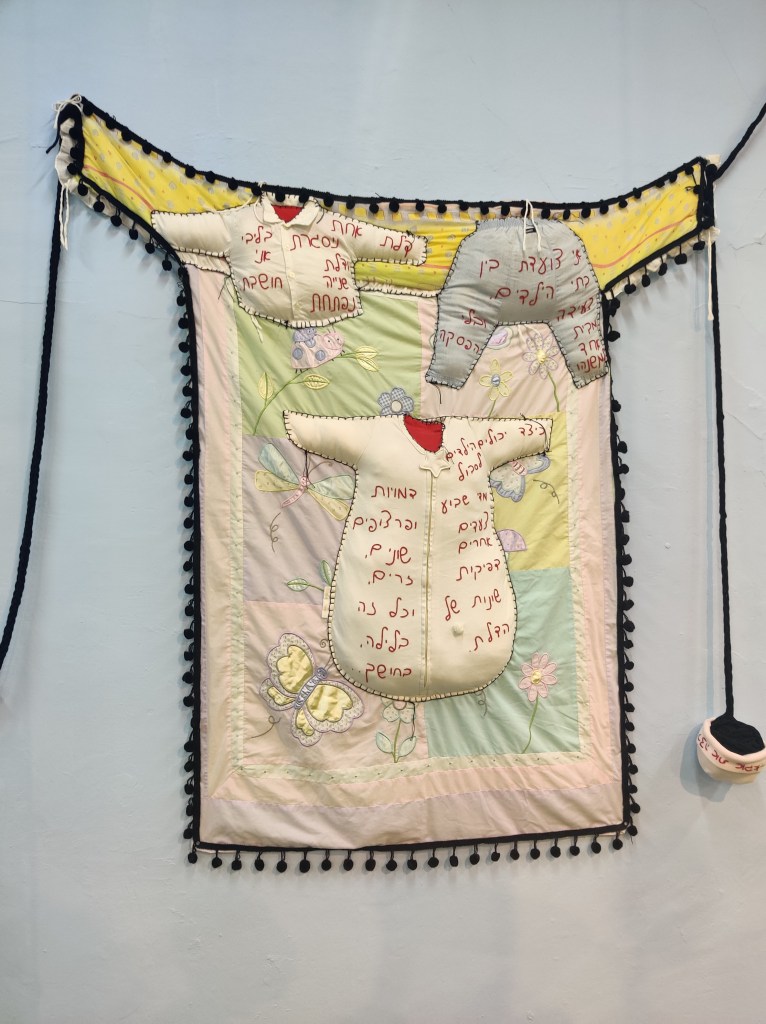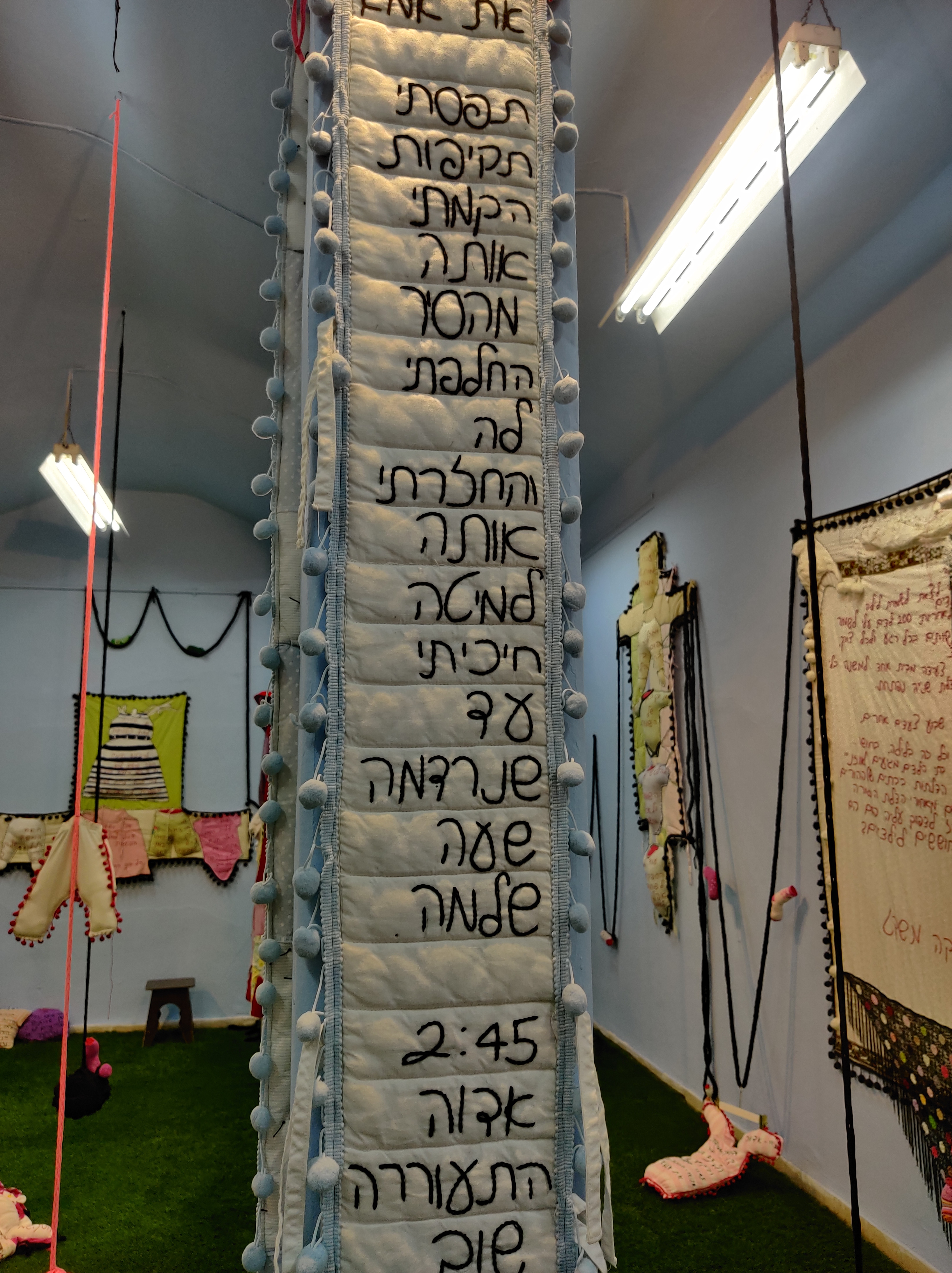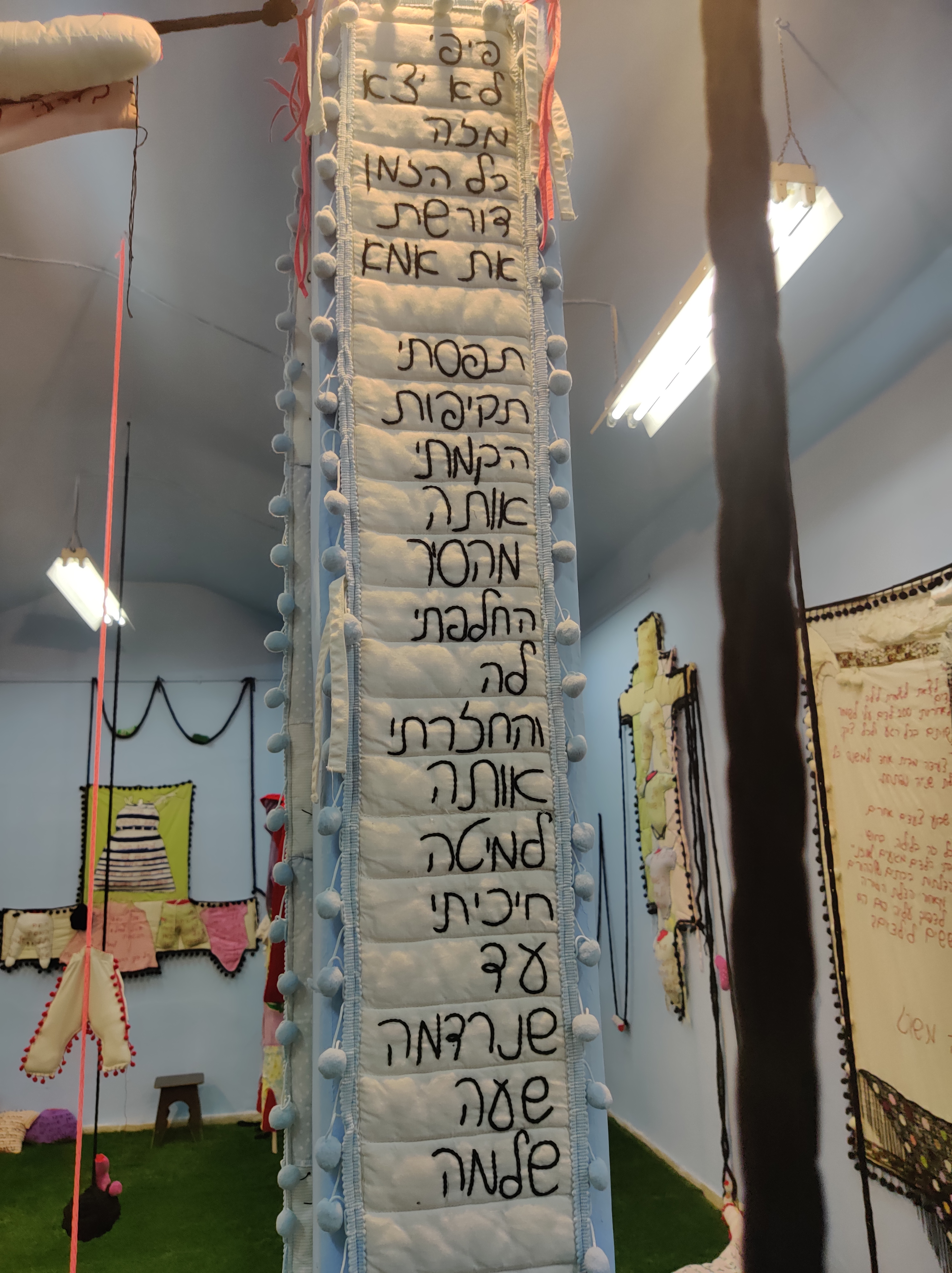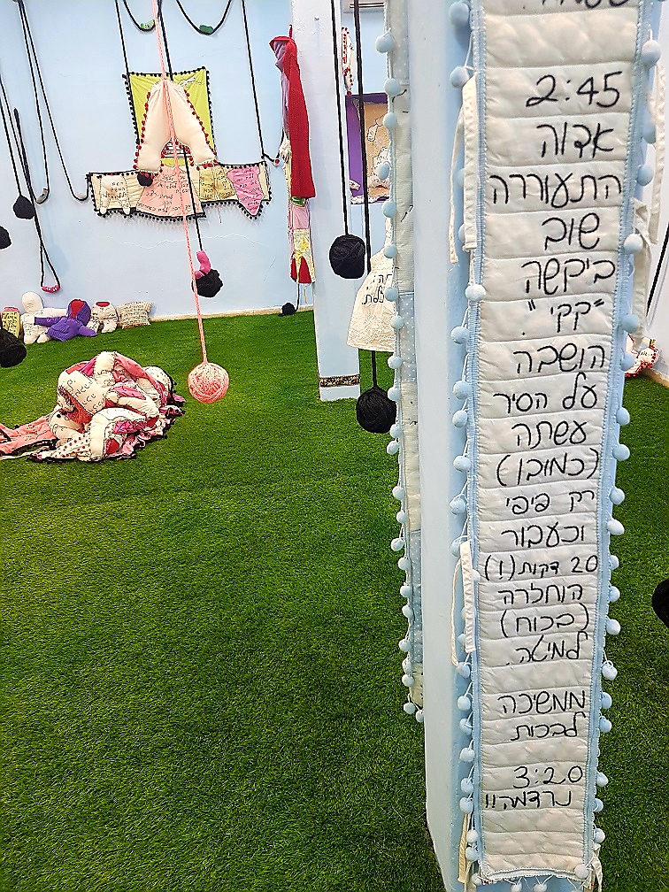 מרחב הגלריה מעורר השתאות. הקירות והתקרה שבו צבועים תכלת (צבע המהדהד לגן "תכלת" בו גדלה). בחלל מוצגות עבודות תפירה ורקמה – כריות, שמיכות בובות ופריטים נוספים מעולם התינוקות. למשפטים הרקומים עליהם תפקיד מבאר, מנחה ואף מכמיר לב. התערוכה מפעילה את הצופה/מבקר המשוטט בין העבודות, נכנס ויוצא בעדן, חווה אותן.