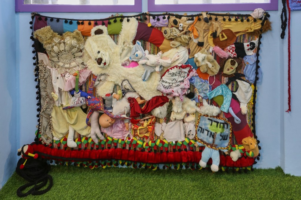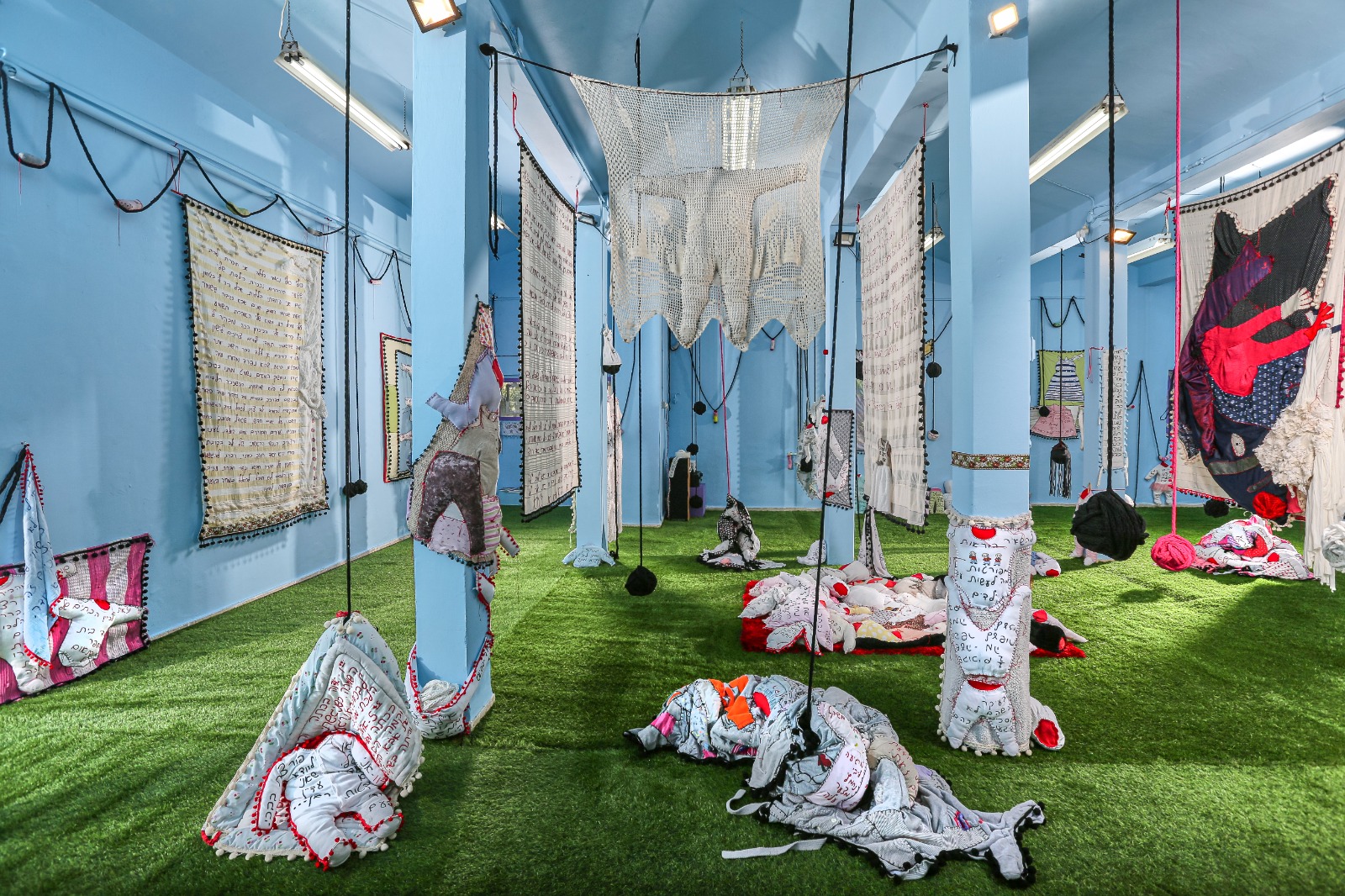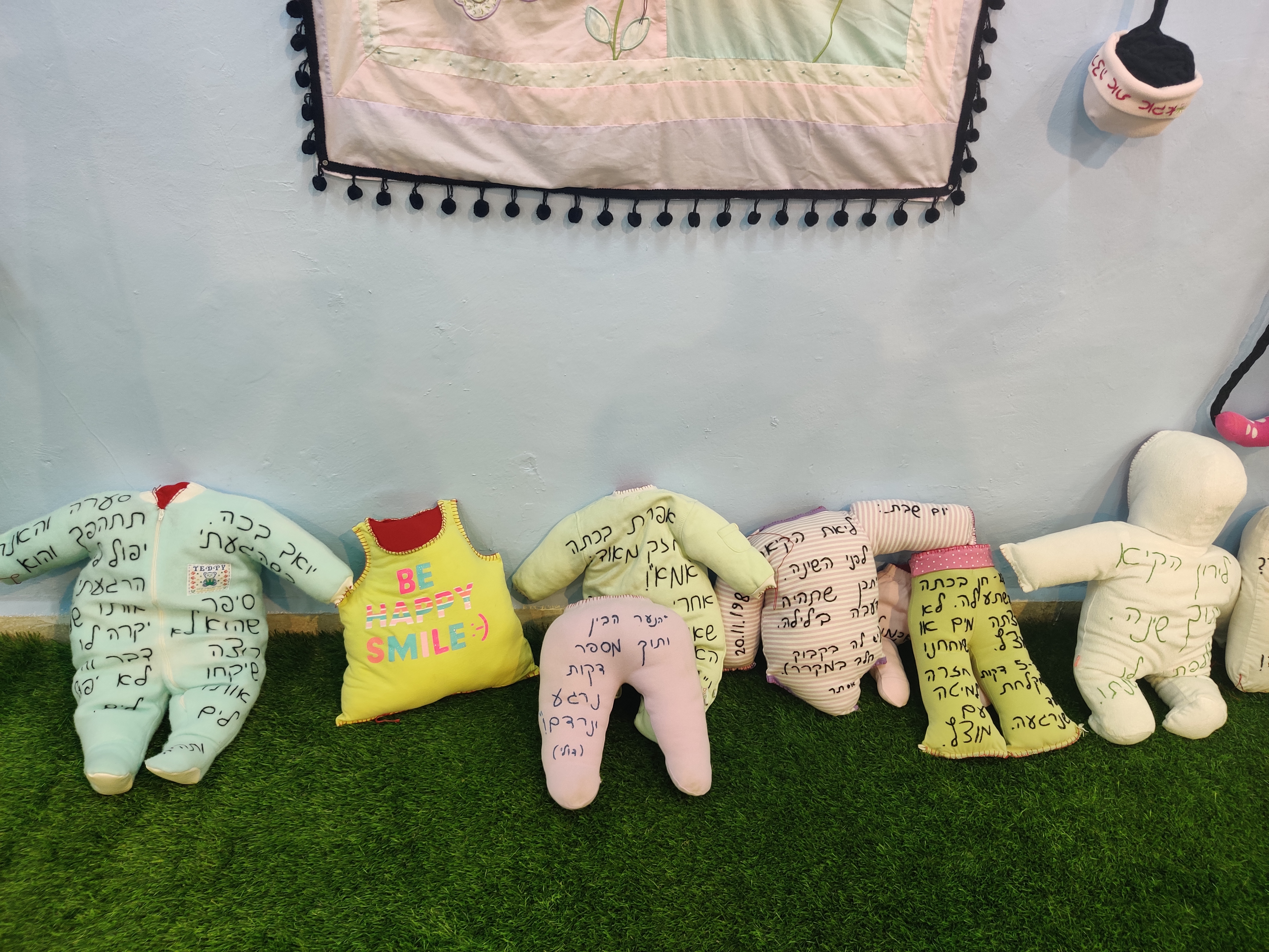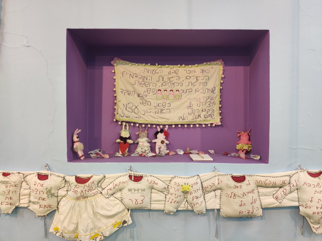 מרחב הגלריה מעורר השתאות. הקירות והתקרה שבו צבועים תכלת (צבע המהדהד לגן "תכלת" בו גדלה). בחלל מוצגות עבודות תפירה ורקמה – כריות, שמיכות בובות ופריטים נוספים מעולם התינוקות. למשפטים הרקומים עליהם תפקיד מבאר, מנחה ואף מכמיר לב. התערוכה מפעילה את הצופה/מבקר המשוטט בין העבודות, נכנס ויוצא בעדן, חווה אותן.