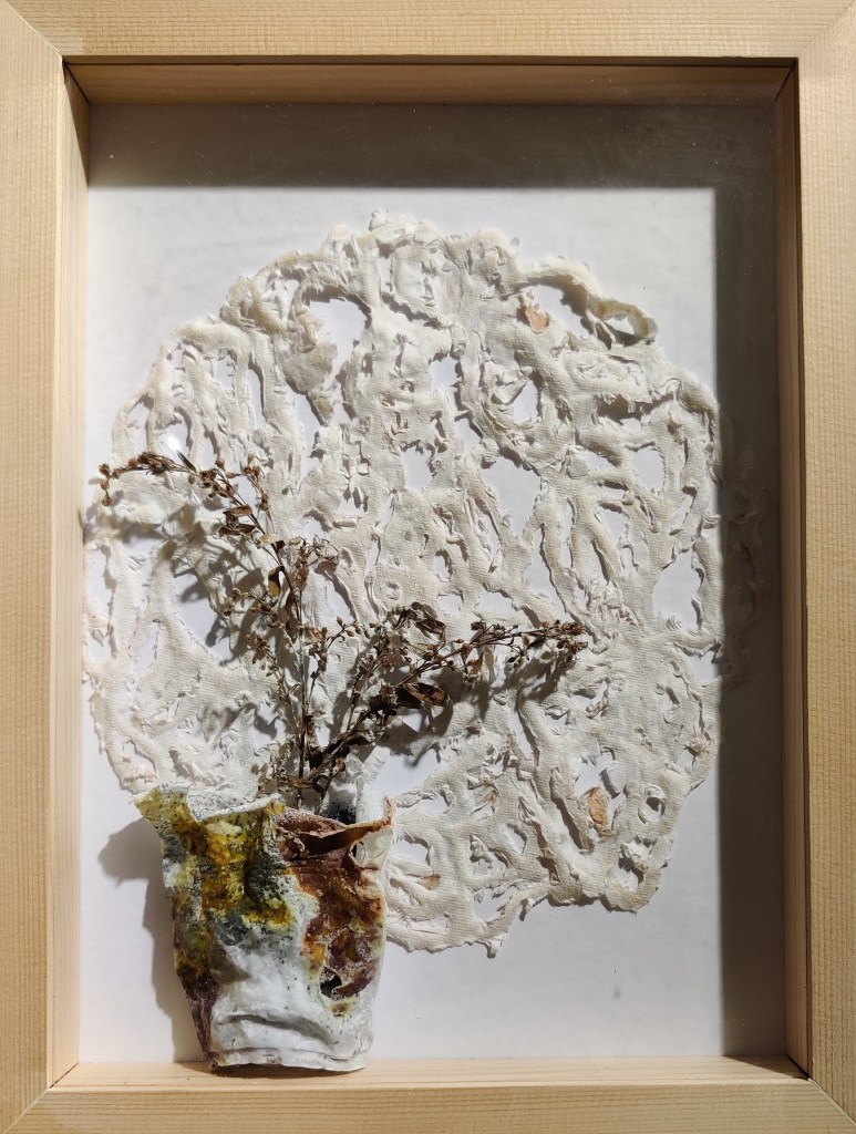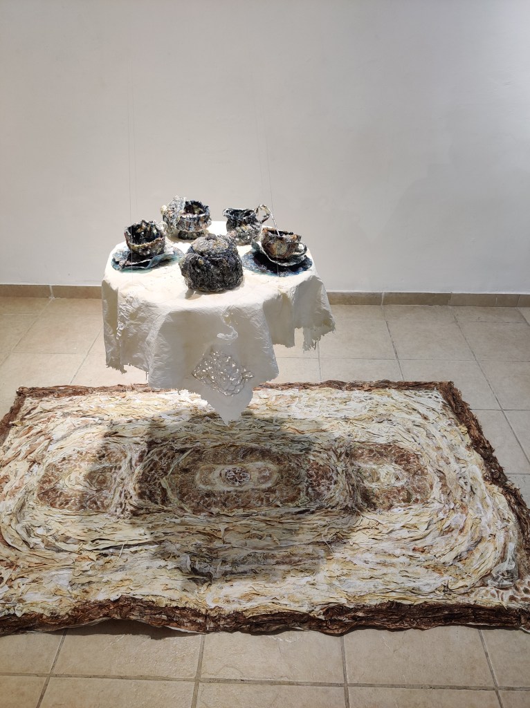 בשיחות עמה סיפרה האמנית על עברה כביולוגית, עיסוק המשיק להווה ולאופן ההסתכלות שלה באובייקטים ובחומרים. על תהליך העבודה שלה, שמערב ניסוי, תהייה, בדיקה – שימוש בדבק, אליו נוספים מלח ופיגמנטים לעתים חול וסודה לשתייה, ואף צבעי מאכל. כל אלה יוצרים מארג דקיק באמצעותו היא מצפה ומעתיקה את הכלים. התוצאה, מרקמים בעלי יופי מעודן ושברירי. כל אלה זוכים לייצוג שיש בו מן האווריריות ומתן מקום לכל פרט ופרט בתערוכה.