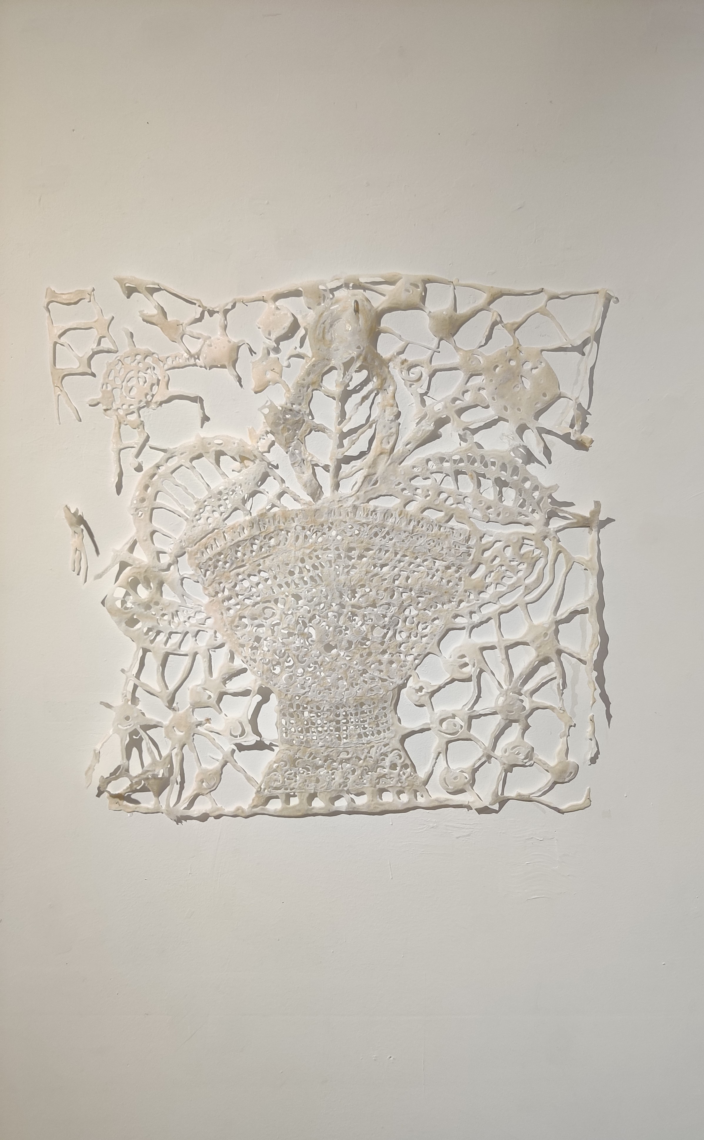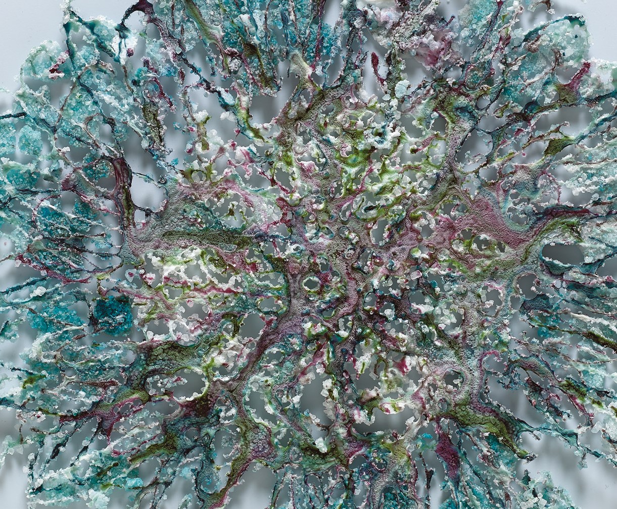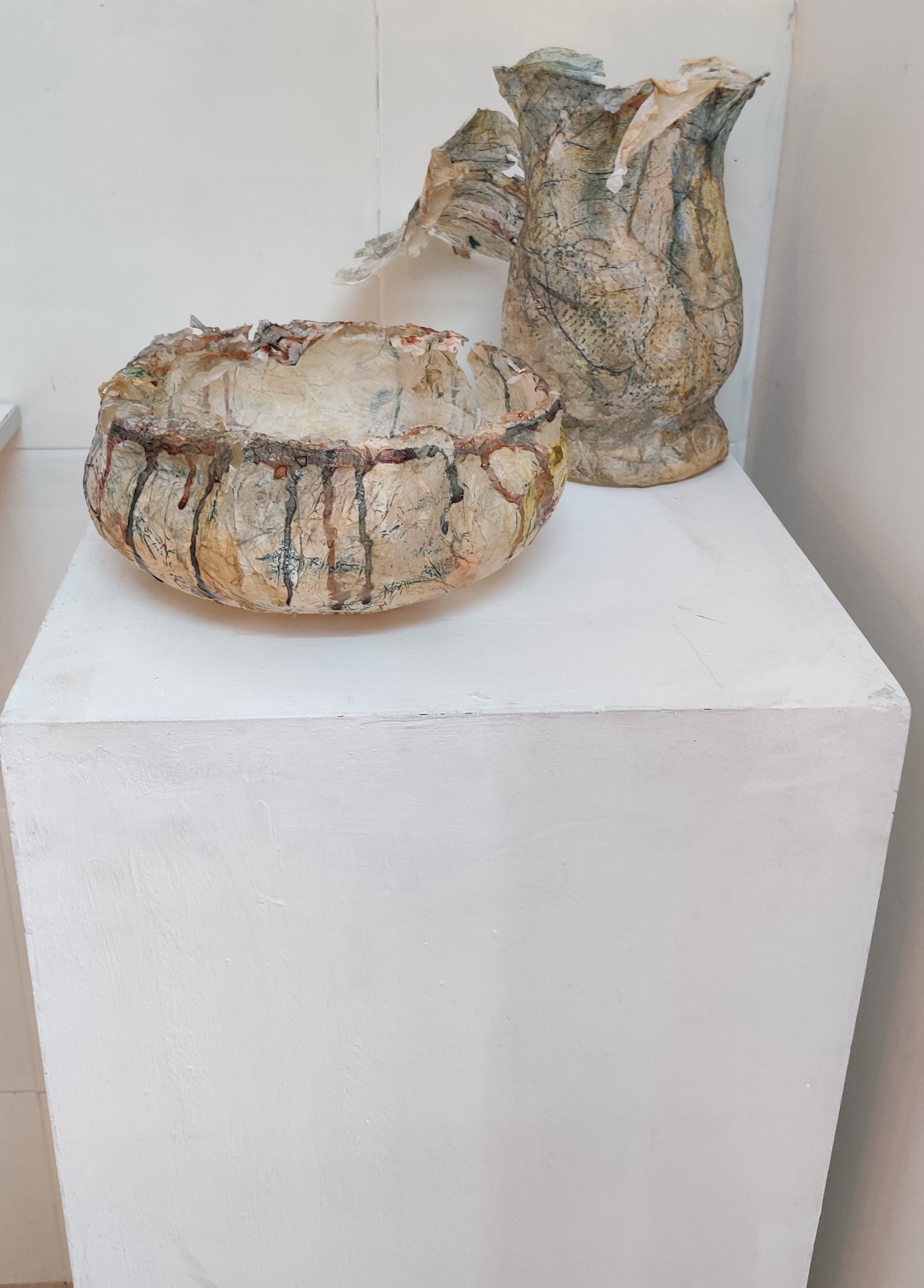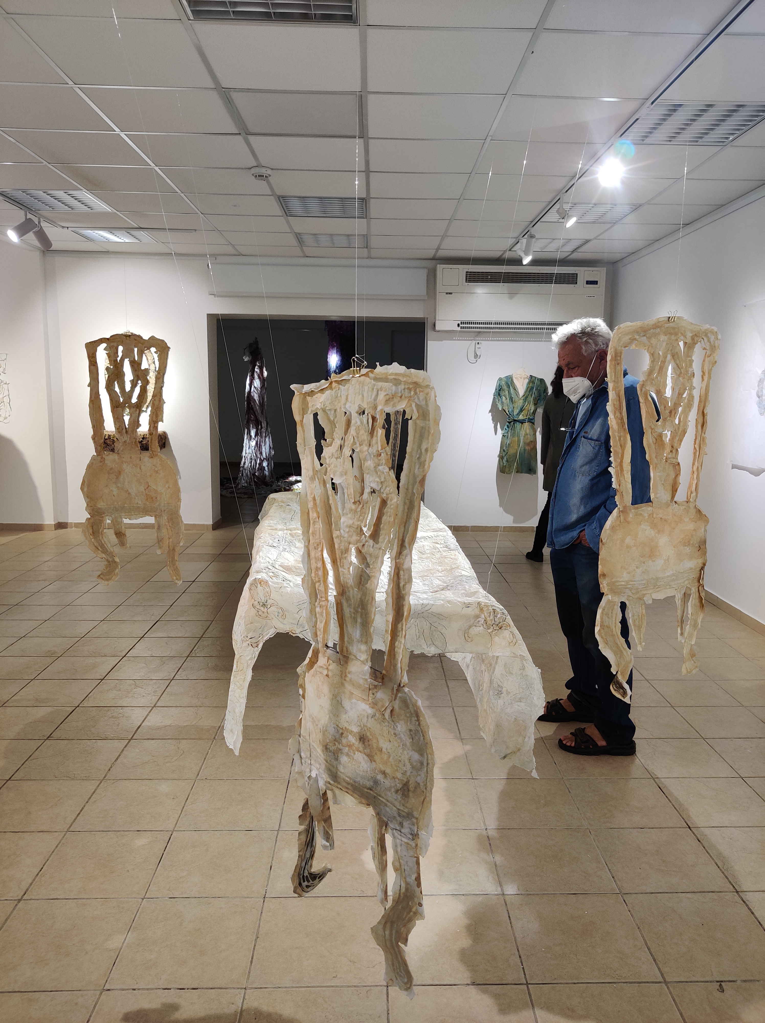 בשיחות עמה סיפרה האמנית על עברה כביולוגית, עיסוק המשיק להווה ולאופן ההסתכלות שלה באובייקטים ובחומרים. על תהליך העבודה שלה, שמערב ניסוי, תהייה, בדיקה – שימוש בדבק, אליו נוספים מלח ופיגמנטים לעתים חול וסודה לשתייה, ואף צבעי מאכל. כל אלה יוצרים מארג דקיק באמצעותו היא מצפה ומעתיקה את הכלים. התוצאה, מרקמים בעלי יופי מעודן ושברירי. כל אלה זוכים לייצוג שיש בו מן האווריריות ומתן מקום לכל פרט ופרט בתערוכה.