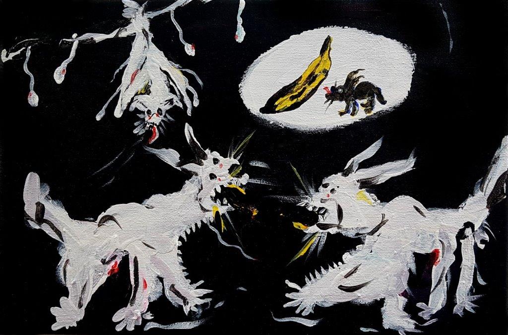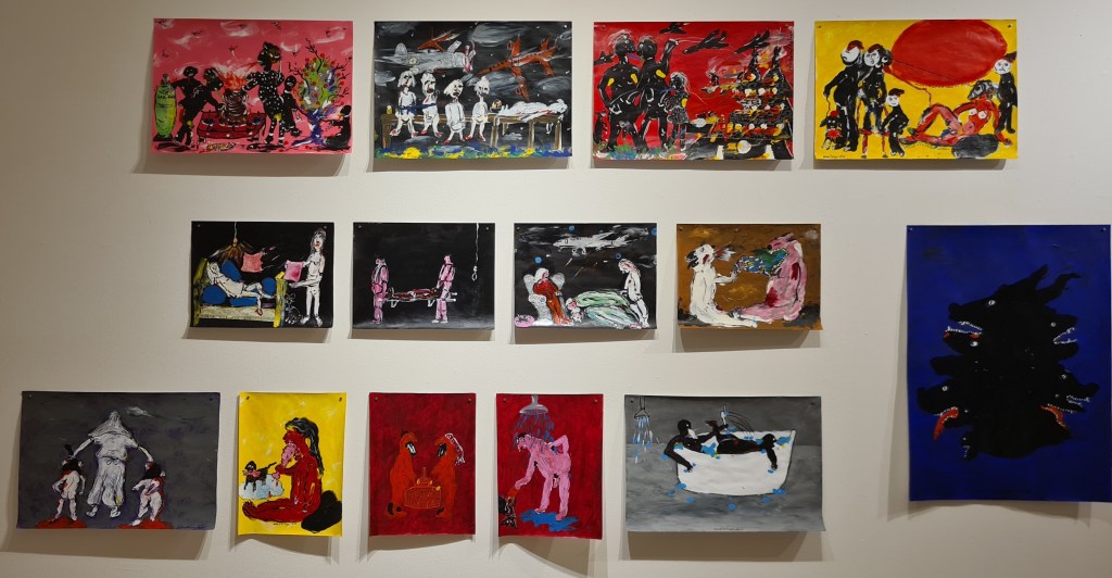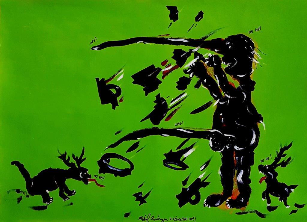 בעבודות המוצגות במוזיאון אשדוד ניכר הדיאלוג אותו מנהל האמן עם אמני גרפיטי, קריקטורות, ועוד. בציורים מוצג ערב רב. דמויות זעירות, מעוותות והיברידיות, פניהן מחוקות ולעתים חסרות צביון אנושי, מעין הכלאה של אדם, חיה, חיה/בעל כנף? אדם/חייזר? חדי קרן (unicorns), כלבים מרובי ראשים (מעין קרברוס) חורצים לשון. לעתים הדמויות מנהלות שיח ביניהן, חושפות לוע חייתי ושיניים משוננות, בשיח שיש בו מן האלימות והמיניות הבוטה. ויש שהן פונות אל הצופה, מבטן חידתי. באחת העבודות, דמות שאפה ואיבר מינה מזדקרים קדימה…מוקפת בכלבים חורצי לשון. בחלק גדול מהעבודות כתב היד חופשי, אקספרסיבי, ולעתים מערב דימוי מדוקדק. בעבודה אחרת ניכרת השראה ממסיכת פולחן אפריקאית או מהאיים ונוצר דיאלוג בין הדימוי העשוי במשיכות מכחול נקיות בצד הכתם האדום המתפשט, החומרי במהותו. ובדומה, ציור בו מעמת האמן דימוי עשוי בקפידה (מטחנה) בצד כתמי צבע אדומים המצוירים באופן חופשי. תינוק שחור עם דימויי מטוסים כסמל? כסמן? החידתיות ניכרת ברוב העבודות, החידתיות, חסרות המענה. השפעות העולות על הדעת הן מז'אן מישל בסקייאה, אך לא רק. ניכרת קרבה עם עבודותיו של ז'אן דובופה בעבודותיו ממחצית שנות ה-40 של המאה ה-20 המתכתבות עם גרפיטי, גבוה ונמוך, עם עבודותיו של ז'אן פוטרייה, בשרבוט הקווי, ואף עם עבודותיו של קית' הרינג בציור הדמויות על קירות שונים בברלין, פיזה, מילווקי, ניו יורק ועוד ובעיקר בעבודות המוצגות בסטודיו שלו בניו יורק.
