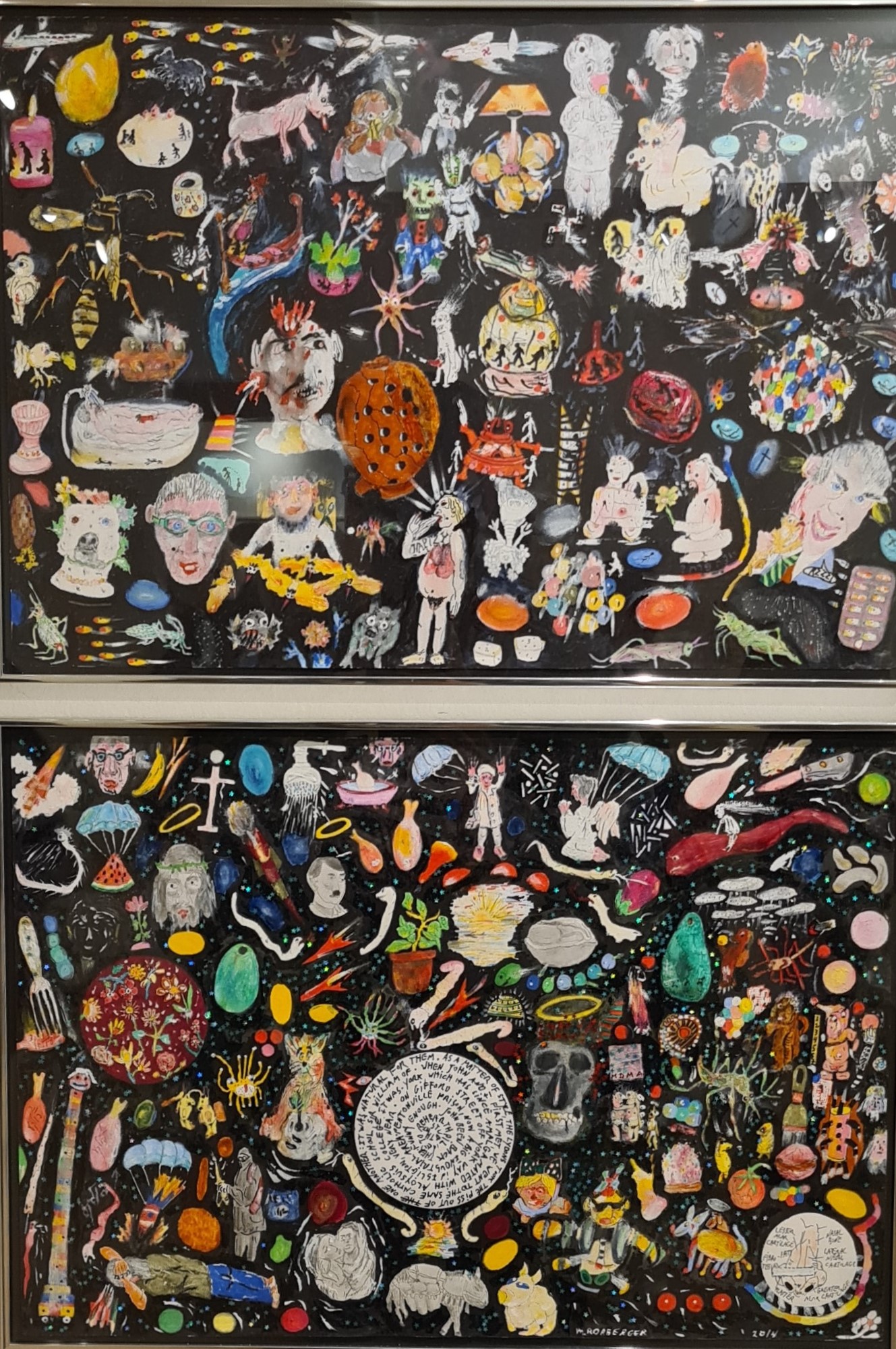 בעבודות המוצגות במוזיאון אשדוד ניכר הדיאלוג אותו מנהל האמן עם אמני גרפיטי, קריקטורות, ועוד. בציורים מוצג ערב רב. דמויות זעירות, מעוותות והיברידיות, פניהן מחוקות ולעתים חסרות צביון אנושי, מעין הכלאה של אדם, חיה, חיה/בעל כנף? אדם/חייזר? חדי קרן (unicorns), כלבים מרובי ראשים (מעין קרברוס) חורצים לשון. לעתים הדמויות מנהלות שיח ביניהן, חושפות לוע חייתי ושיניים משוננות, בשיח שיש בו מן האלימות והמיניות הבוטה. ויש שהן פונות אל הצופה, מבטן חידתי. באחת העבודות, דמות שאפה ואיבר מינה מזדקרים קדימה…מוקפת בכלבים חורצי לשון. בחלק גדול מהעבודות כתב היד חופשי, אקספרסיבי, ולעתים מערב דימוי מדוקדק. בעבודה אחרת ניכרת השראה ממסיכת פולחן אפריקאית או מהאיים ונוצר דיאלוג בין הדימוי העשוי במשיכות מכחול נקיות בצד הכתם האדום המתפשט, החומרי במהותו. ובדומה, ציור בו מעמת האמן דימוי עשוי בקפידה (מטחנה) בצד כתמי צבע אדומים המצוירים באופן חופשי. תינוק שחור עם דימויי מטוסים כסמל? כסמן? החידתיות ניכרת ברוב העבודות, החידתיות, חסרות המענה. השפעות העולות על הדעת הן מז'אן מישל בסקייאה, אך לא רק. ניכרת קרבה עם עבודותיו של ז'אן דובופה בעבודותיו ממחצית שנות ה-40 של המאה ה-20 המתכתבות עם גרפיטי, גבוה ונמוך, עם עבודותיו של ז'אן פוטרייה, בשרבוט הקווי, ואף עם עבודותיו של קית' הרינג בציור הדמויות על קירות שונים בברלין, פיזה, מילווקי, ניו יורק ועוד ובעיקר בעבודות המוצגות בסטודיו שלו בניו יורק.