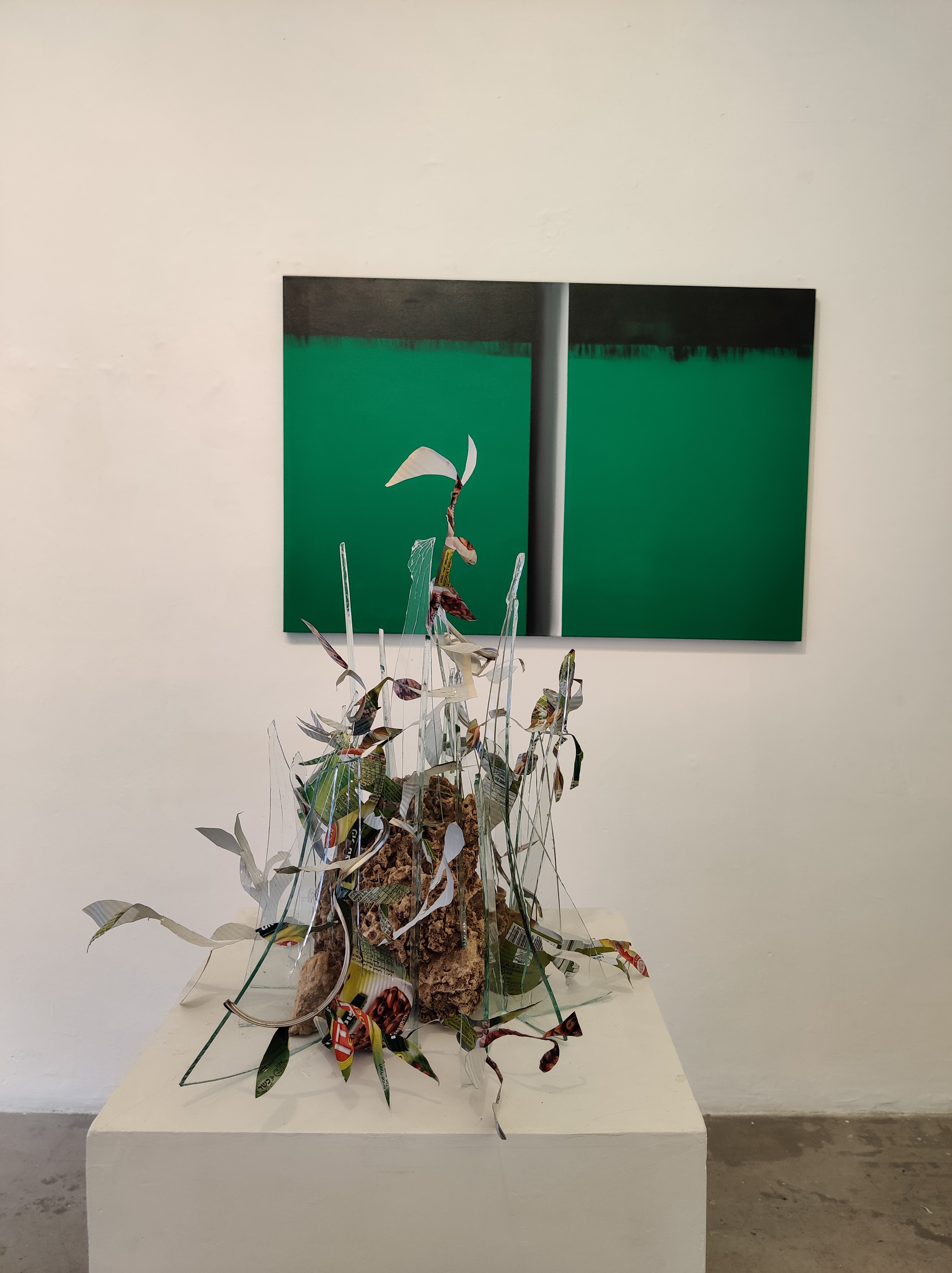 בתערוכה מדיה שונות – ציור, פיסול, תבליט, שימוש ברדי מייד, בשפה – אותיות ומלים, ועבודת וידיאו. ניכרת בהן הניעות בין טבע לתרבות בין שרידי קופסת שימורים המומרת למעין שיח על משטח עץ, חלקי זכוכית שבורה המיתמרים אל על, משטחים רבועים המדמים חדר או מקום, עבודות המעלות על הדעת חרירי הצצה מוגדלים והשיח שהן מנהלות עם שפת הציור.