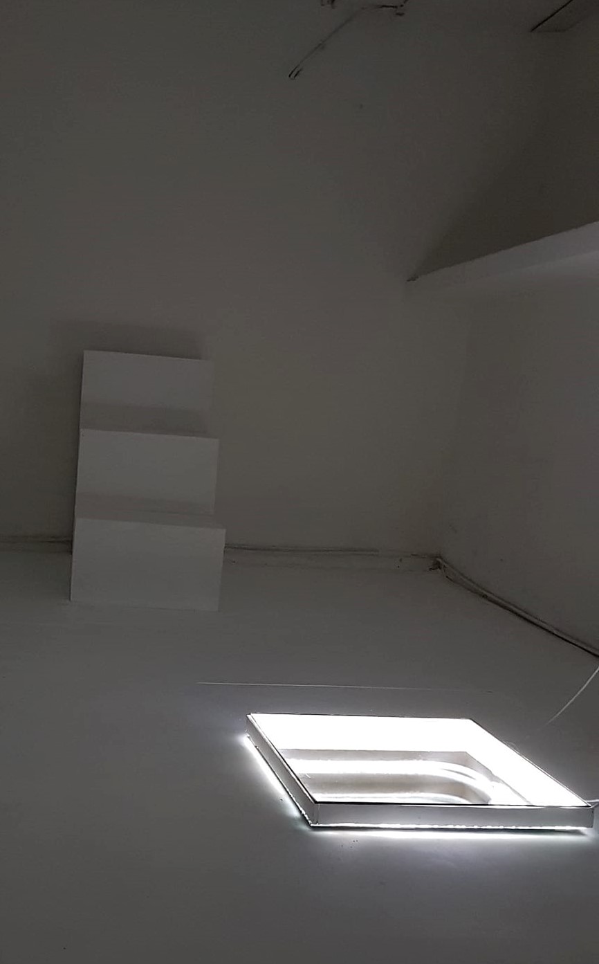 המיצב פועל ומתפקד בין סיפים ובין זמנים, מצוי בין הלובן המואר באמצעות אור מלאכותי, לבין "השחור" המסקרן להשתהות ולהשתאות, לנסות להעלות מהחלל המצוי בריבוע המואר מהויות נוספות. המיצב משלב את עבודת הסאונד של ניר ג'ייקוב יונסי, אמן סאונד, ארבעה רמקולים במעגל סגור, וכשמסתובבים בחלל כל אחד מהם יוצר תדר שונה.