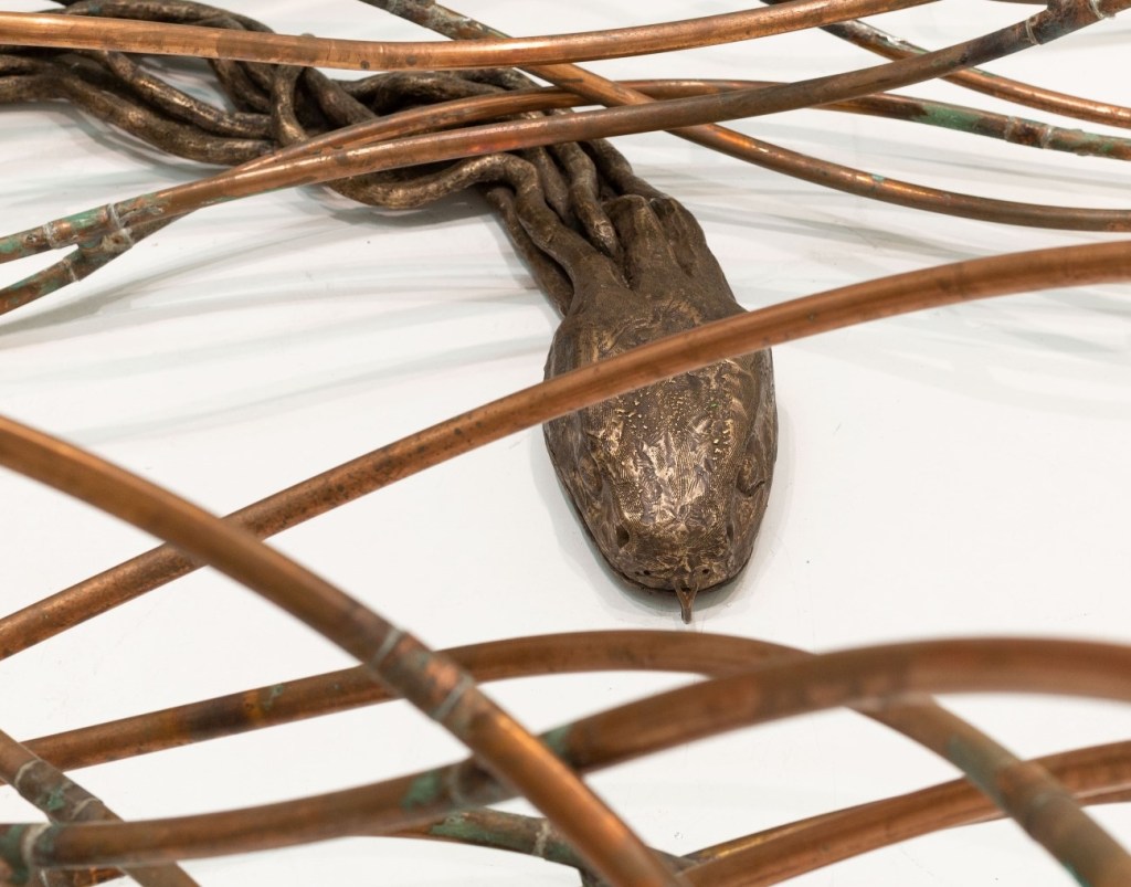 המיצב מורכב מצינורות נחושת השזורים זה בזה, ובקצותיהם ראשי נחש מארד.