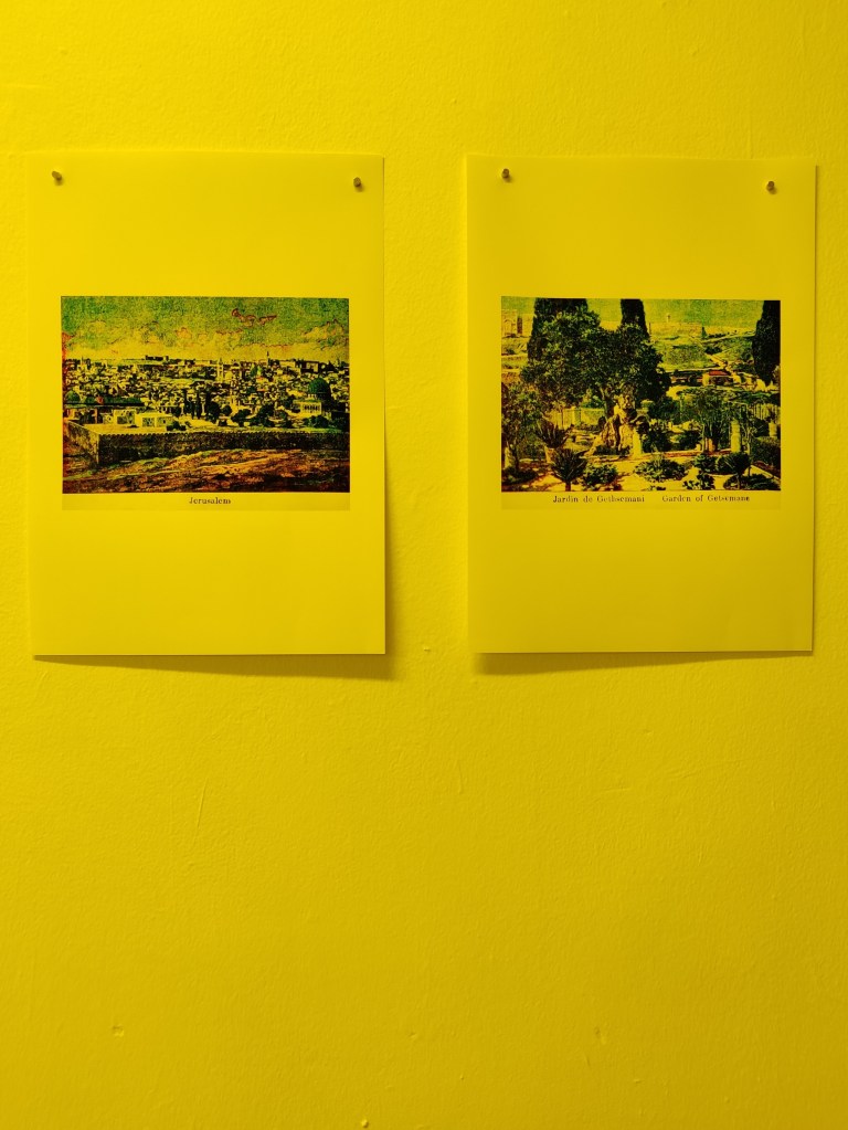 לצד שתי עבודות הווידיאו ישי מציגה מספר עבודות נוספות וביניהן פסל של כיפה מוזהבת, המזוהה עם העיר, עם ההיסטוריה המורכבת שלה. כמו כן עבודת ניאון צהוב, חלקה נשען על אחד הקירות וחלקה מוצג על הרצפה, שבירה באופן הצגתה בחלל, וכן שני תצלומים גדולים: תצלום הר הזיתים, בן שלושה חלקים. המקום המקודש לשלושת הדתות – יהדות, נצרות ואסלם, ונקשר גם באיזכורים של יום הדין ותחיית המתים, ותצלום נוסף של קבר רחל. שני התצלומים מצוין בטקסט הם חלק מהסדרה "נוף קדוש" של האמנית. כאן בחרה ישי דימויים מתוך ספרון מהמאה ה-19. דימויים המשלבים מבט נוסטלגי של ערים ומקומות מקודשים: תצלומי של חול, בצד כאלה שמציגים אתרים שחשיבותם היסטורית-דתית-פוליטית. ישי המירה אותם לשחור לבן, וניתקה אותם מהקונטקסט ההיסטורי והפוליטי שלהם בכך שחתכה מהם רצועות צרות "שום עיר בשום מקום" (כמצוין בטקסט)