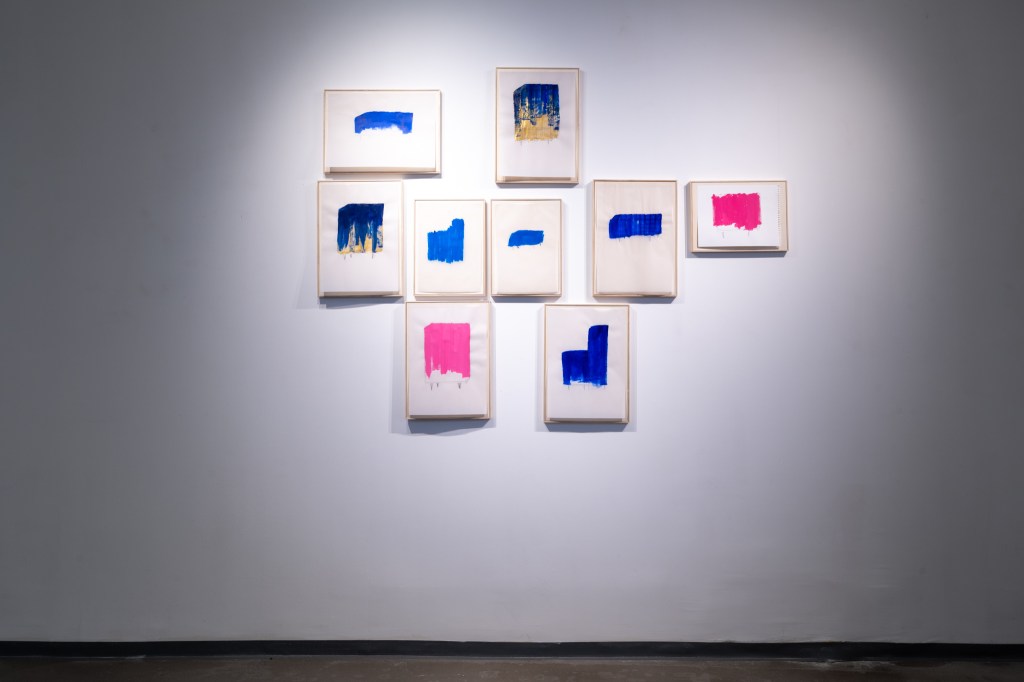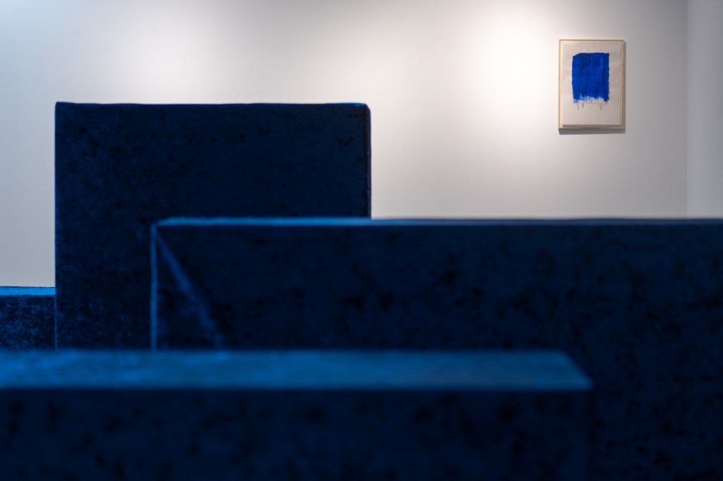 הכחול כמעין "מלכודת דבש" הצדה את מבטו של הצופה הנכנס לחלל התערוכה. וממנו נפנית העין אל העבודות הקטנות המפעימות, בהן מופיע איזכור לחפצים דוגמת כורסא, קובייה או שמא אלו משיכות מכחול חופשיות במספר צבעים שאף הם נושאים עמם משמעות.