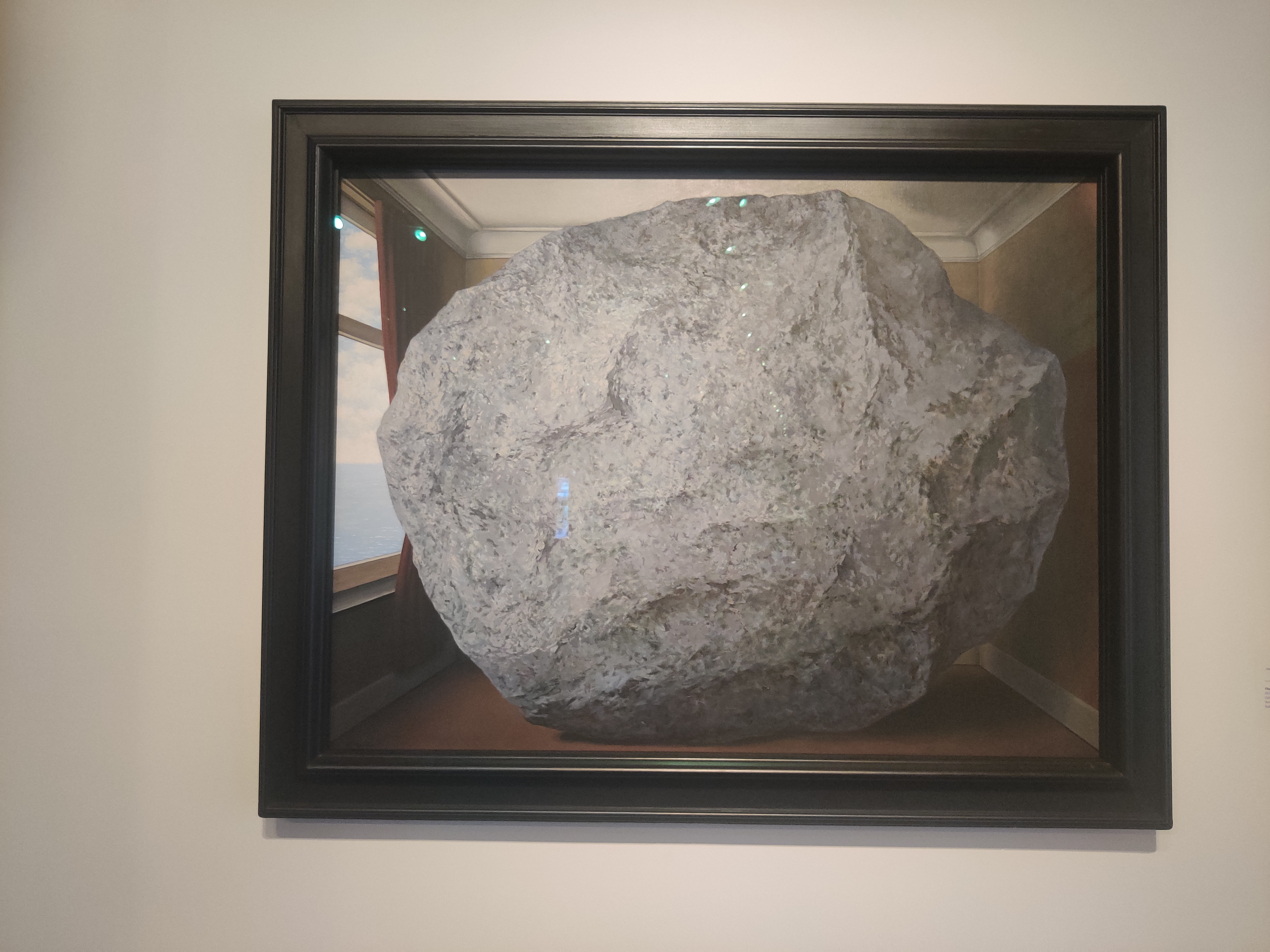 יצירה זו של מגריט, זכתה לפרסום עצום ולשעתוק. היא מאתגרת את עין הצופה וטורדת את מנוחתו: מה אנו רואים? האם זו מציאות? או שמא דימוי שיש בו מן המסתורין והדמיון, כוח המשיכה, האם תשקע במי הים? הניגוד בין קשיות האבן לבין רכות העננים. בתערוכה מוצגות בנוסף יצירות שהובאו לראשונה לארץ, המדגימות את התפתחות מוטיב האבן בעבודותיו של מגריט, וכן השפעות שהיו לעבודתו זו על אחרים.