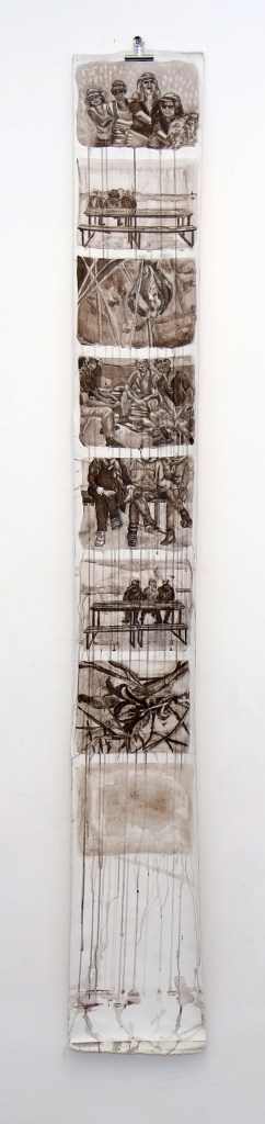 הציורים בתערוכה בנוסף לפסלים מהווים רקע של צבעים וצלילים עבורה. בציורים מהדהדים המקצבים האפריקאים של ילדות האמנית ובהם גם משתקפים שברירי זיכרונות של הבית בו גדלה, סמטאות ונופי ילדותה.[3] באחד הציורים כמעין מגילה, מתוארים בני המחזור שלה, "גרעין השומר הצעיר" שעמו עלתה לארץ והוא לדידה המשפחה שלה, המלווה אותה בכל, בחיים ובאמנות. ציורים אחרים מתכתבים עם שפת האמנות המודרניסטית, קו, צבע, מחבר, קולאז' ועוד.