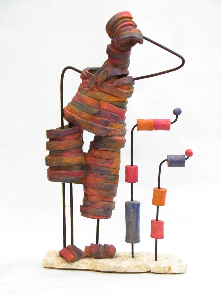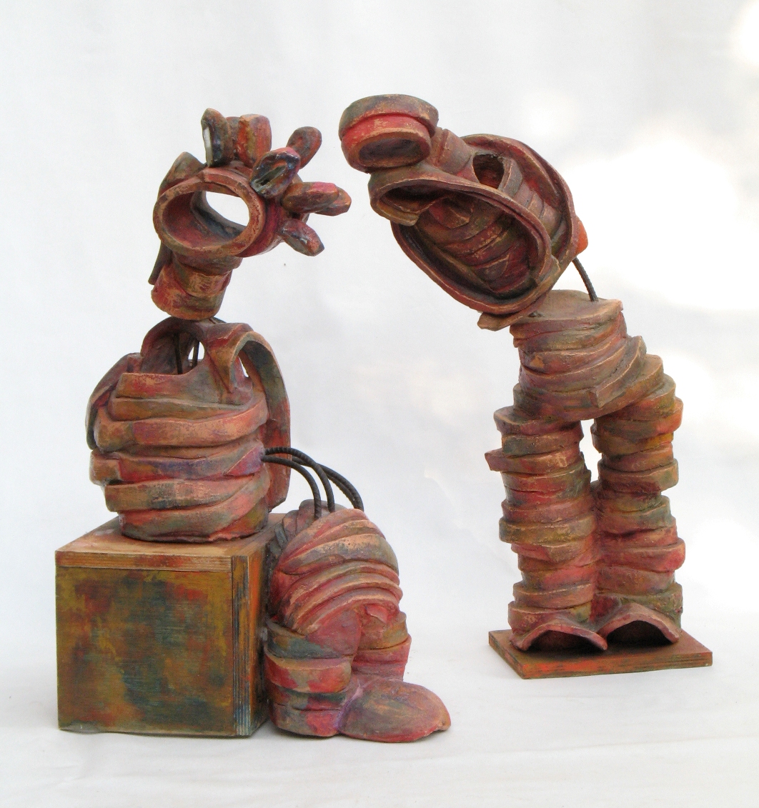 בתערוכה פסלים ממספר סדרות: בפסלים מתוך הסדרה "ערכים", הדמויות עשויות מרצועות חומר, עץ ובחלקן ברזל. האמנית עיצבה את הדמויות במנעד מצבים – חשיבה, תהייה, דיבור וקשב, ובחלקן אף ניכרת חשיבה הומוריסטית. בעבודות אלו ואחרות המוצגות בתערוכה, ניכר המתח בין המסיביות של הגוף לבין הראש שתוכו חלול ומנהל דיאלוג עם החלל המקיף אותו.