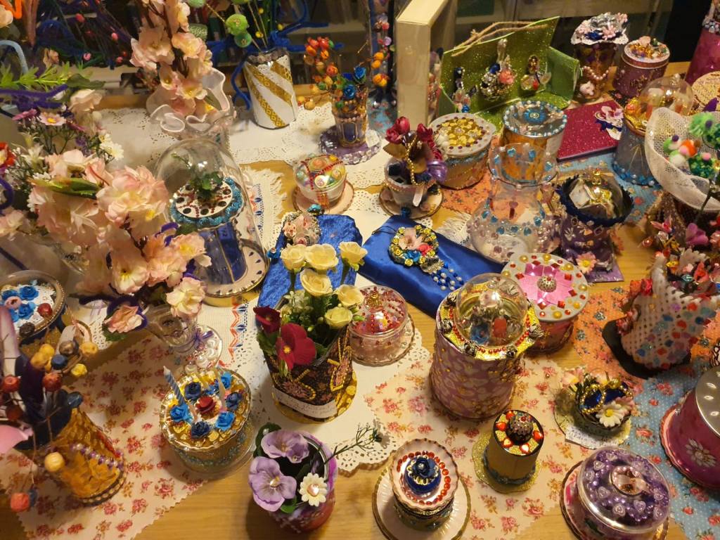 שִׁפעת החפצים (רדי מייד מטופל) מממקדת את עין הצופה, מפתה להתקרב, לגעת, לבדוק. צנצנות זכוכית, קופסאות פלסטיק צבועות ומעוטרות באבנים צבעוניות, עוגות ועדיים, חרוזים, פרחי בד, נייר עטיפה וסרטים, מדבקות בצבעי אדום שני, כחול עמוק, אך גם גוונים של צהוב, ורוד ותכלת ואחרים בעבודה שיש בה מן העמלנות. "כל פריט, קופסה וצנצנת, הם גיבורים דינמיים במסע השתנות, מוצבים על פי מקריות מתוכננת – לברוא פסק זמן חזותי, לשחרר דחפים בסיסיים, ליהנות מפרצי יצירה בלתי נדלית ולחבור לרוח המצאה משובב". (ד"ר דורית קדר, ציטוט מטקסט התערוכה).