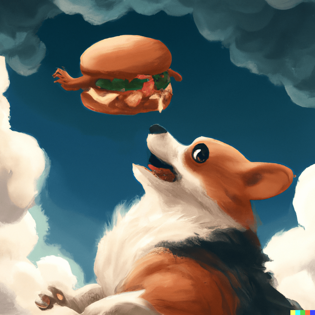 DALL·E2 – a korgi eating humburger on the sky painted by caravaggio