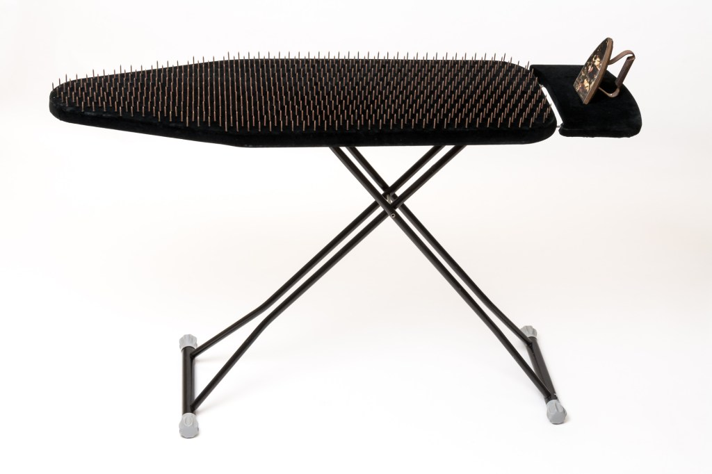 הֶצְרֵף:  קרש גיהוץ, 700 מסמרי פלדה, בד קטיפה, לוח עץ, מגהץ ברזל ישן, חלק מצילום של "משמר הלילה" של רמברנדט.