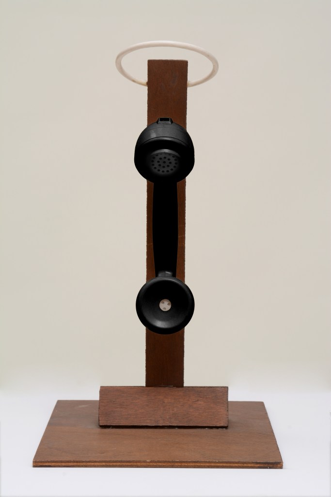 חומרים: עץ לבוד, שפופרת טלפון של חברת בזק, כבל תקשורת.