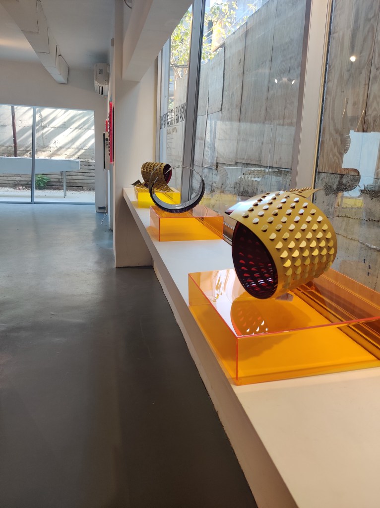 בתערוכה, אובייקטים פיסוליים בתלת ממד, חלקם מוצבים על פדסטלים ויש התלויים/מוצגים על קירות הגלריה, מאתגרים את עין הצופה באשר לתפיסת הממד שבהם, והתנועה הנוצרת בעין המתבוננת. ומנגד בעומקה של התערוכה, פרגוד מוזהב וטריפטיכון.[1]