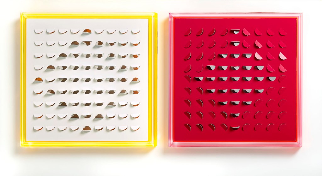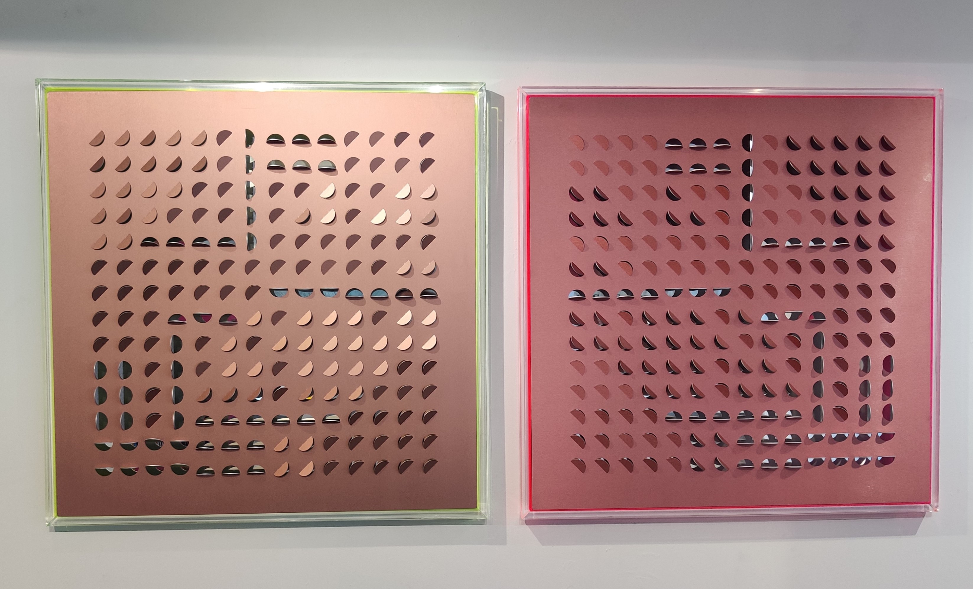 העבודות מזמינות להציץ מבעד לחיתוכי הלייזר. וכאן נכונה הפתעה… עומקם של החרכים/חתכים המתכתיים משתקף במראה שמאחוריהם, ובדומה משתקפים בה פניו של הצופה המציץ פנימה והופך לחלק מהיצירה ולשותף פעיל בה. בנוסף, הצבעוניות הנעה בין צבעוניות חמה לקרה בשילוב עם הפלדה והזכוכית מאפשרת השתקפויות של אור טבעי ומלאכותי ומשחקי תנועה ומקצב. מהלך זה מאזכר את אמנות האופ ארט[2] ואת תנועת הצופה אל מול האובייקט המוצג, וההתרחשות – שינוי מתמיד בתפיסה הוויזואלית של העבודה, בצורות המשתנות בעת תנועה מצד אל צד, ההתפעמות מן הגילוי והחוויה הנלווית לכך.