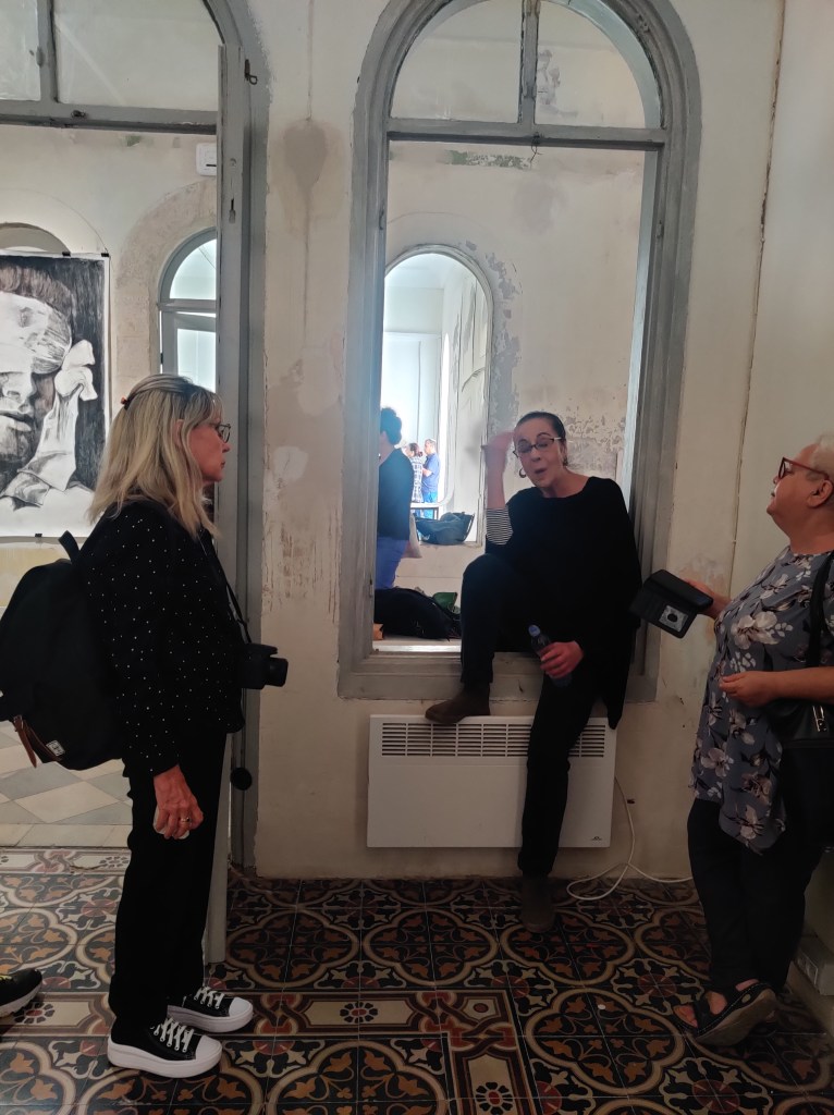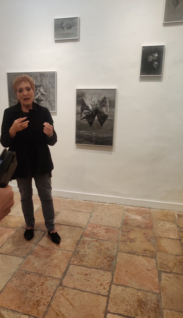 אירית הדר במפגש עמה בבית האמנים, מאחור עבודות של עפרה אייל