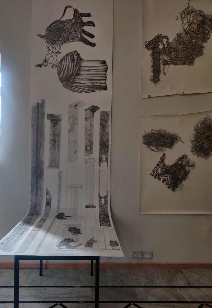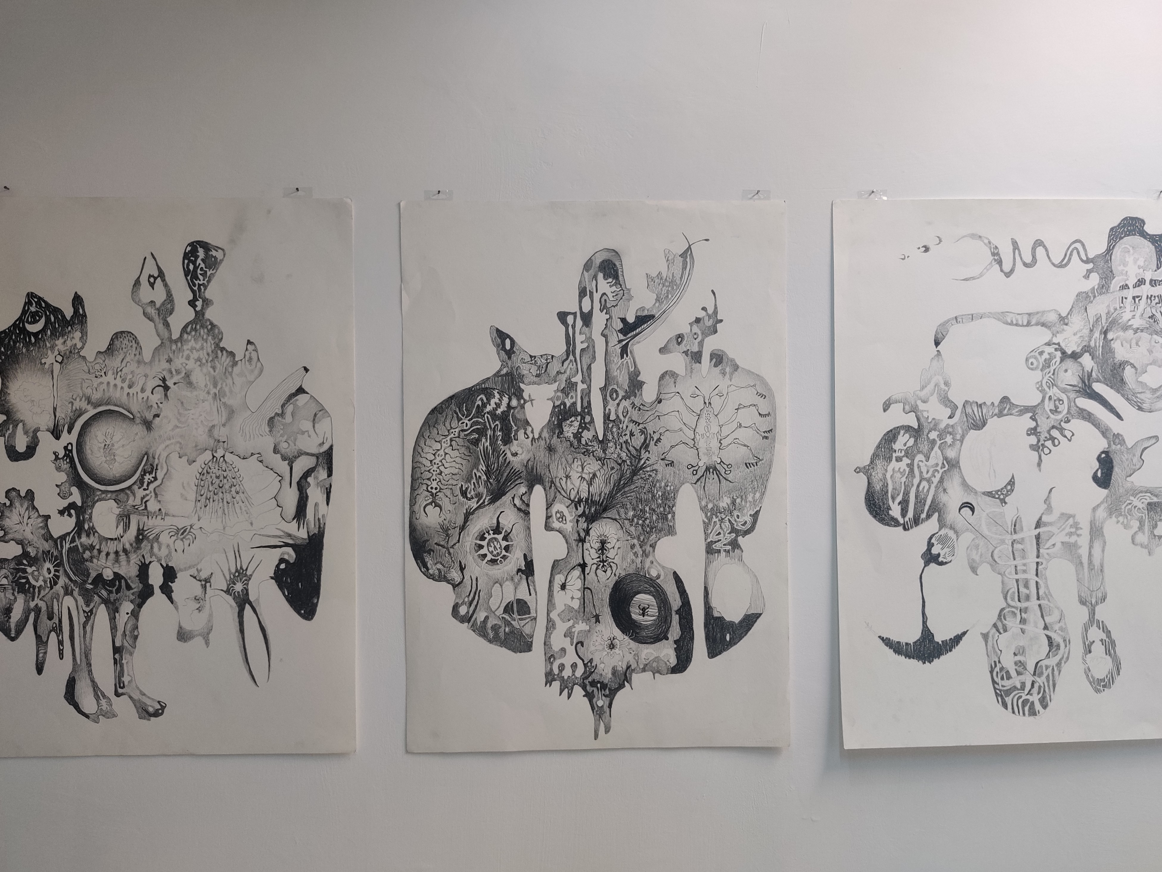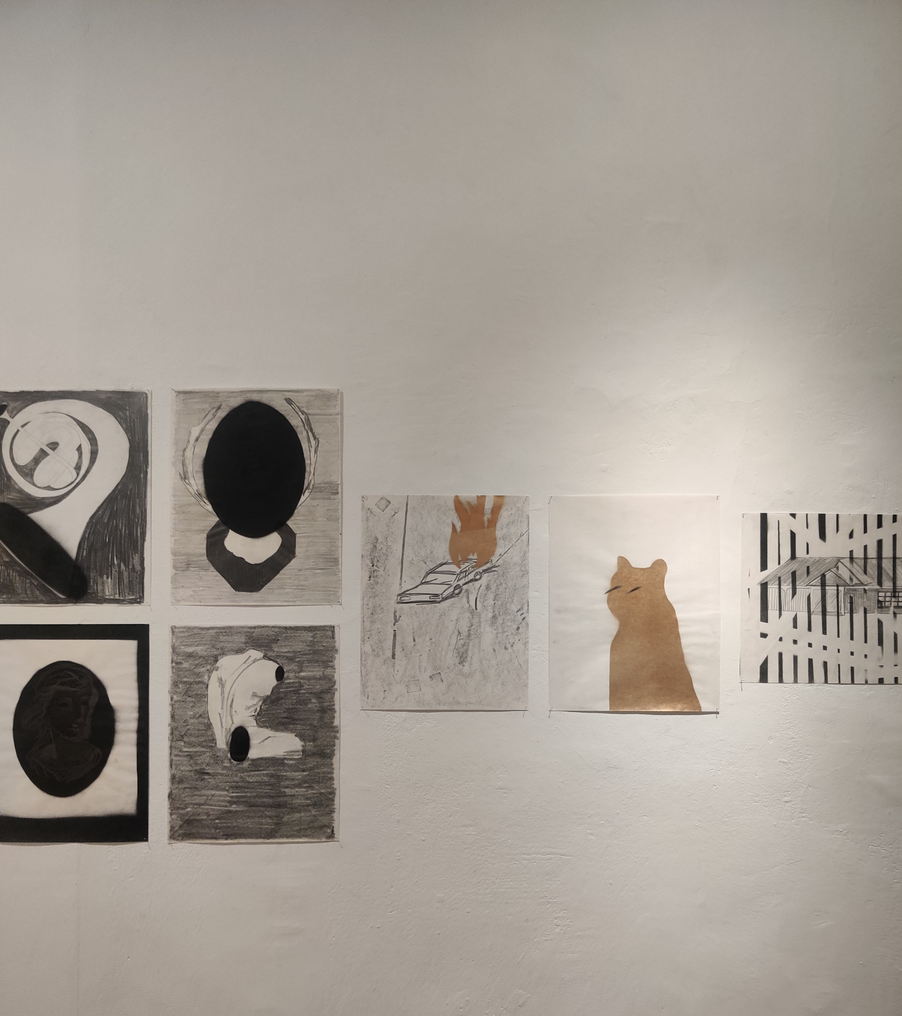 אבל רוב התמונות נראות יותר ככתמים מאשר רישומים….אפילו אם הן נעשות בעיפרון או פחם.לא שזה כל-כך גרוע אם מנסים בעזרת אמצעים קלאסיים של רישום לעשות סדר בבלגאן הכתמים….זה מעניין ואולי אפילו עכשווי,אך האם יש מודעות לכך?