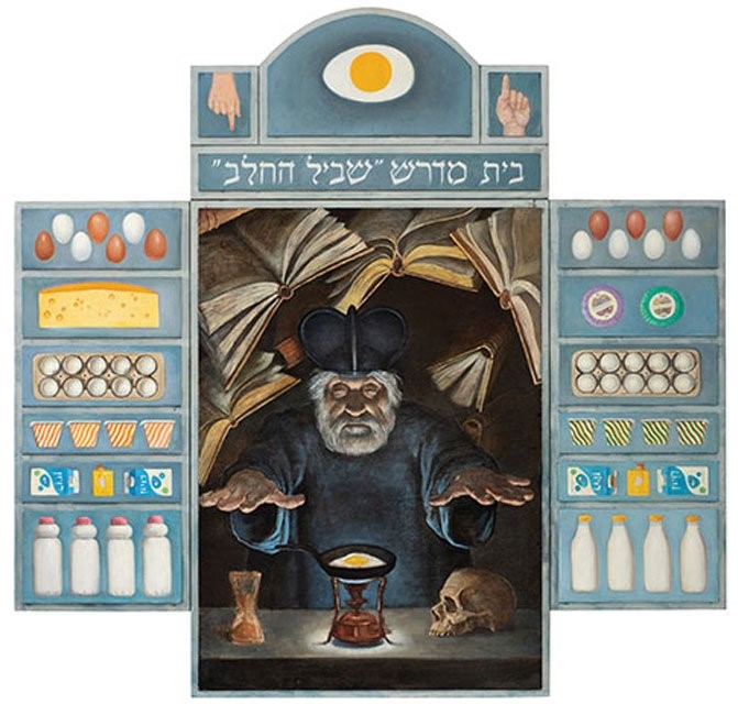 בית מדרש שביל החלב בפנל המרכזי מאחורי הדלפק ניצב איש מבוגר (אפשר אלכימאי, איש דת או שמא מיסטיקן, החוזה עתידות או מנסה לשנות גורלות?) והוא פורש ידיו כמשתתף בטקס נבואי כלשהו. בית המדרש אינו מקום נבואי אבל ה'עין השלישית' המצוירת למעלה כביצה )ומתכתבת עם הביצה שמטגנת על הדלפק) אפשר ומפנה אותנו הצופים אל תורת סוד כלשהי. משני צדיו, מוצגים מוצרי חלב וביצים למכירה.