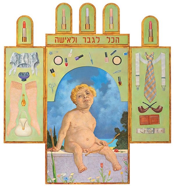 סשה אוקון, "הכל לגבר ולאישה", שמן על עץ, רוחב 161 ס"מ, גובה משתנה 140-191 ס"מ,2020-2022