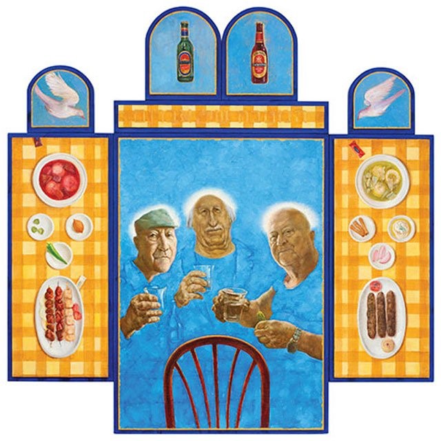משני צדי הציור המרכזי מצוירים מיני אוכל: צלחות ועליהן אוכל ביתי, כמספר הסועדים. הרקע: מפה/ שעוונית משובצת. למעלה, כיאה למטבח הביתי – ניצבות בירות מובהקות בישראליותן, כאילו היו לוחות הברית או סימן לברית שנכרתה. ממעל חגות שתי יונים כמבשרות. הציור טעון במשמעויות, שלוש דמויות, שלושת המלאכים המוזכרים לעיל, השלוש כמספר מקודש ביהדות (שלושת האבות), ובנצרות ("השילוש הקדוש"). היונים – אחד מסמליה של ונוס/אפרודיטה אלת האהבה במיתולוגיה היוונית והרומית, אך גם אטריבוט המופיע בציורי "הבשורה" למריה עת היא מתבשרת על לידת הבן. והיונה כמבשרת שלום. ציור טעון ומורכב, שיש בו מן החברותא, שמחת החיים ואנושיות ולי מזכיר את בני משפחתי שנהגו לשבת ב"קווניקה" מעין בית קפה בו ישבו עולי טורקיה ויוון בשכונת שפירא, תל אביב, ולשתות "לחיים" (בד"כ עראק).