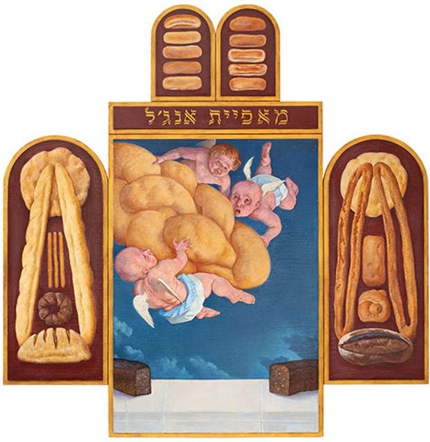 סשה אוקון, "הא לחמא, בייגלה ומיני מאפה", שמן על עץ, רוחב 161 ס"מ, גובה משתנה 140-191 ס"מ,2020-2022
