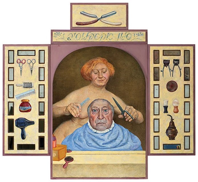 כלים המשמשים לתספורת מקיפים את הדימוי המרכזי שלעיל מכל עבריו. ובנוסף מלווה את העבודה רישום "מכונות עתיקות לגזירת שיער".