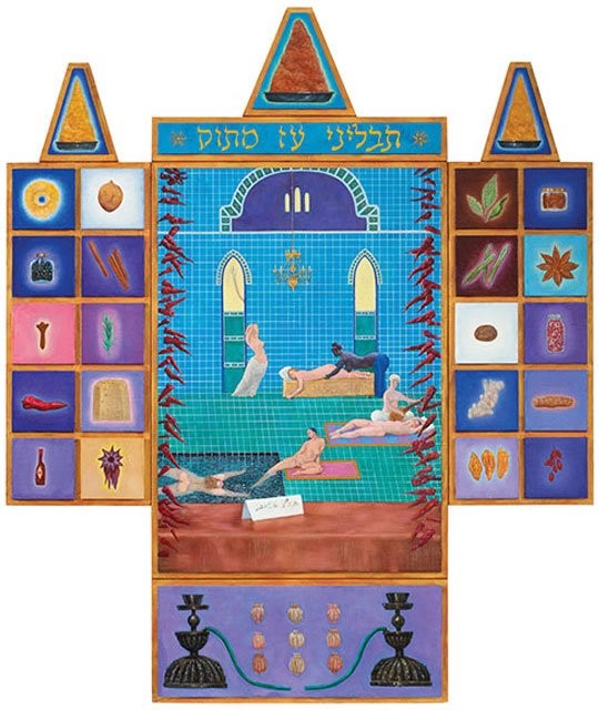 אוקון מייחד את הציור למה שהיה ואיננו: חנויות טיפוסיות בעיירות יהודיות במזרח אירופה בהן מכרו הרינג וקוגל (קיגל כפי שיש קוראים לכך), דגים מלוחים, ממולאים ועוד. גם בשוק מחנה יהודה בירושלים היו בזמנו חנויות כאלו אבל כולן למעט אחת נעלמו, וזו שנותרה – איבדה מצביונה המקורי. בחלקו העליון של הטריפטיך סימן כפות ידיים פרושות בברְכתַּ כהֲֹּניִם (ברכת כהנים מתקיימת פעמיים בשנה, בחול המועד סוכות ובחול המועד פסח. במהלך אמירת הפסוקים על ידי הכוהנים אצבעות ידיהם מתוות סימן מיוחד). באמצעות ציור כפות ידיים מעניק אוקון ממד של קדושה לעולם יומיומי של העיירה היהודית על מאפייניה השונים – אנשיה, המטעמים, החנויות הזעירות…עולם שפס ונעלם.