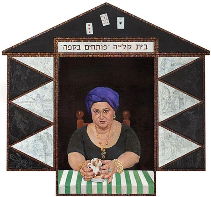 סשה אוקון, בית קלייה "פותחים בקפה", שמן על עץ, רוחב 161 ס"מ, גובה משתנה 140-191 ס"מ, 2020-2022