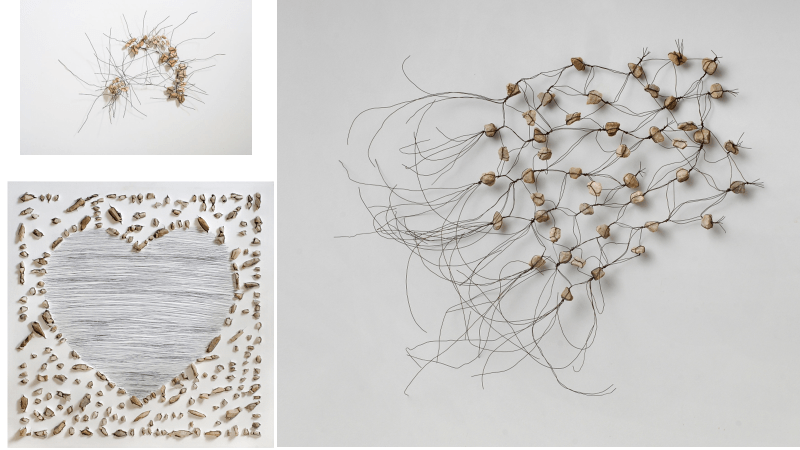 לשאריות שאספה מצוותת האמנית חוטי ברזל אותם היא קונה; למשל, רשת של בנאים אותה היא מפרקת ואזי החוטים עדינים ורכים יותר. העבודות הנוצרות נושאות עמן קונוטציה של רך וקשה, סגור ופרום, מלא וריק, כבידות בצד קלילות.