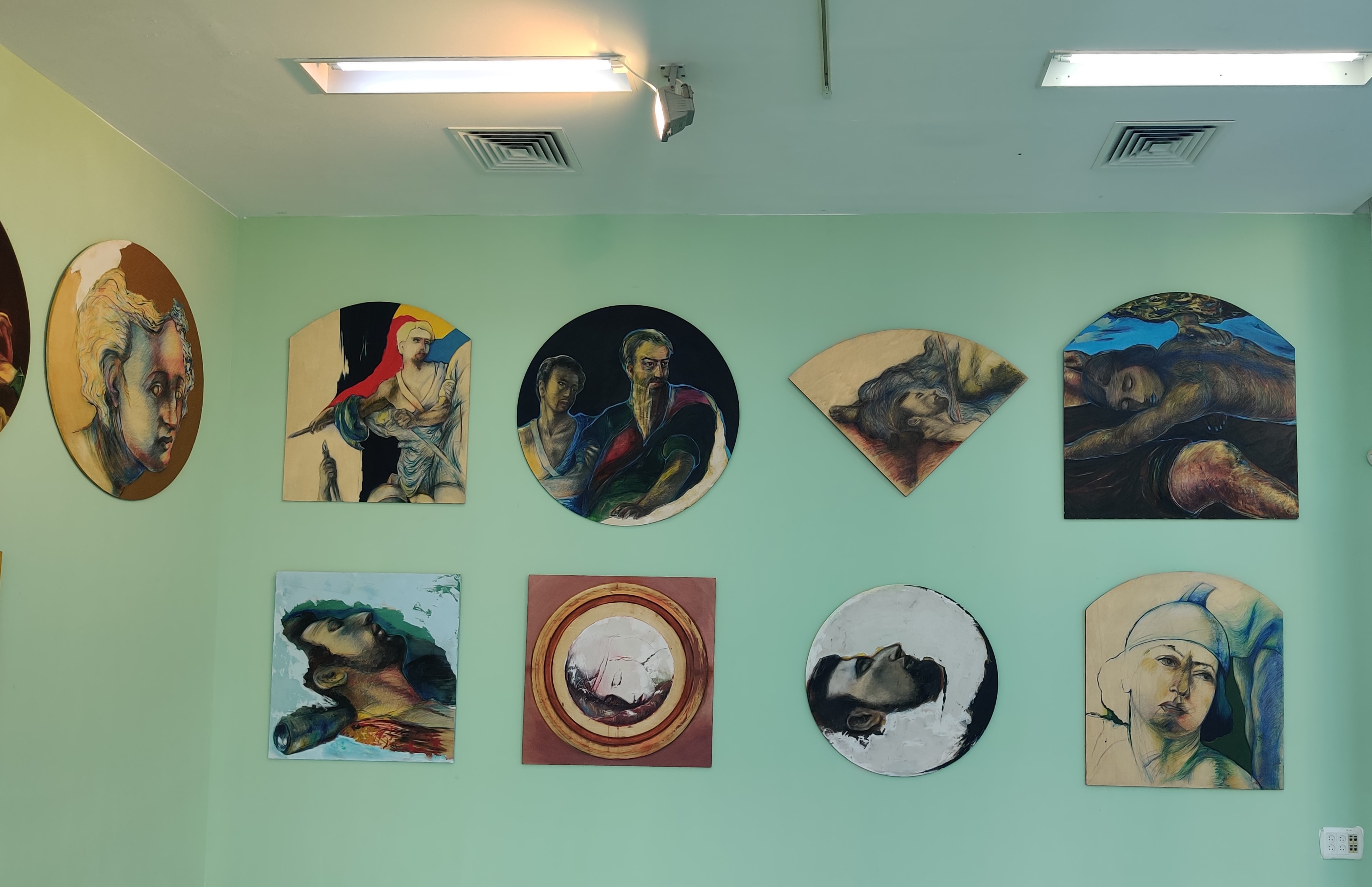 בתערוכה מוצגות 16עבודות שהמאפיין את חלקן הוא הצבעוניות העזה באזכור לעבודותיהם של ציירים מנייריסטים וביניהם פונטורמו אשר פעלו בעיקר באיטליה במאה ה-16. העבודות נעשו בטכניקה מעורבת על עץ צפצפה בגדלים ובצורות שונות לעיתים תוך שילוב עבודה בטייח כבמעין פרסקו.