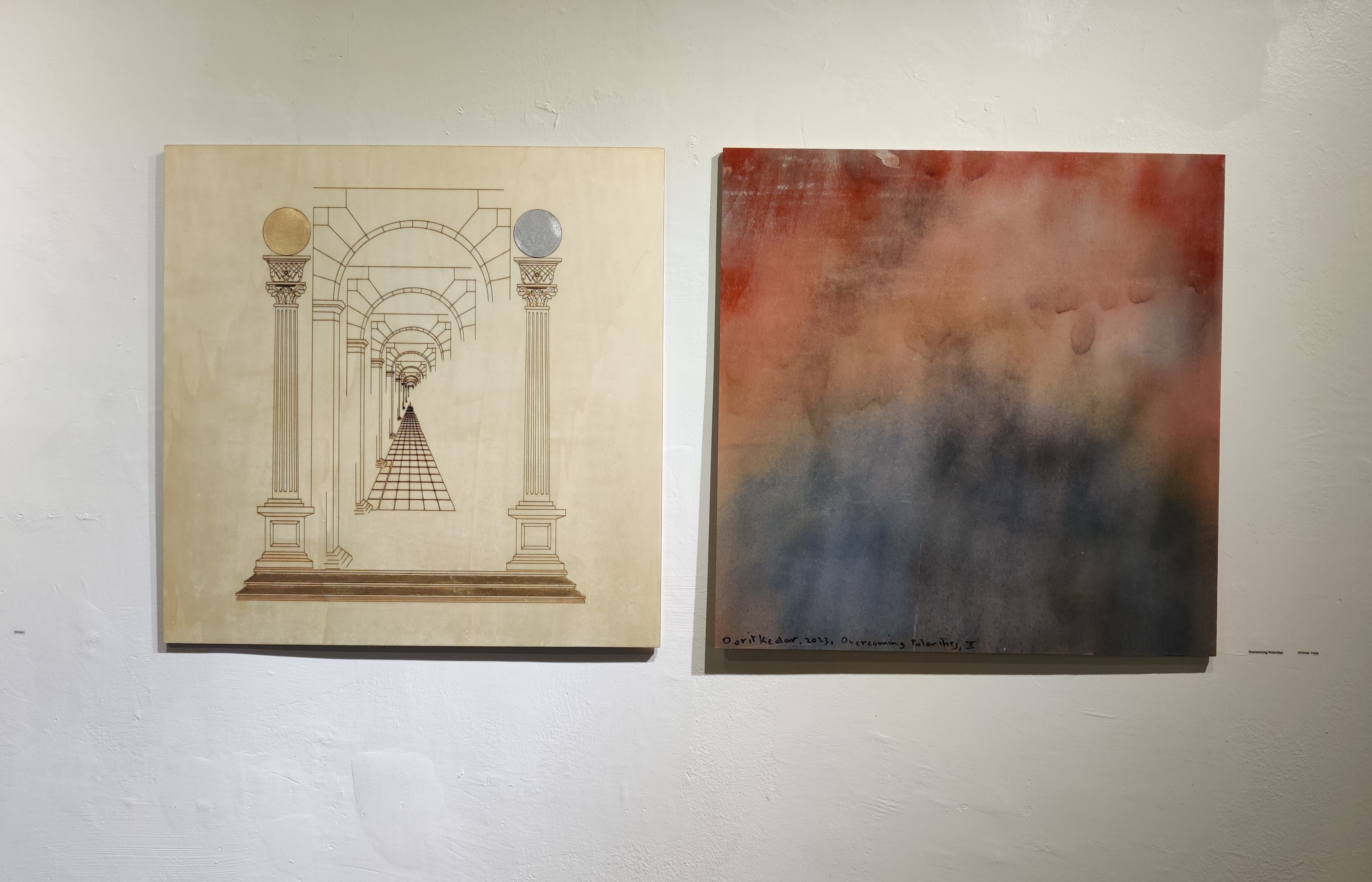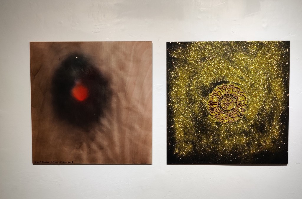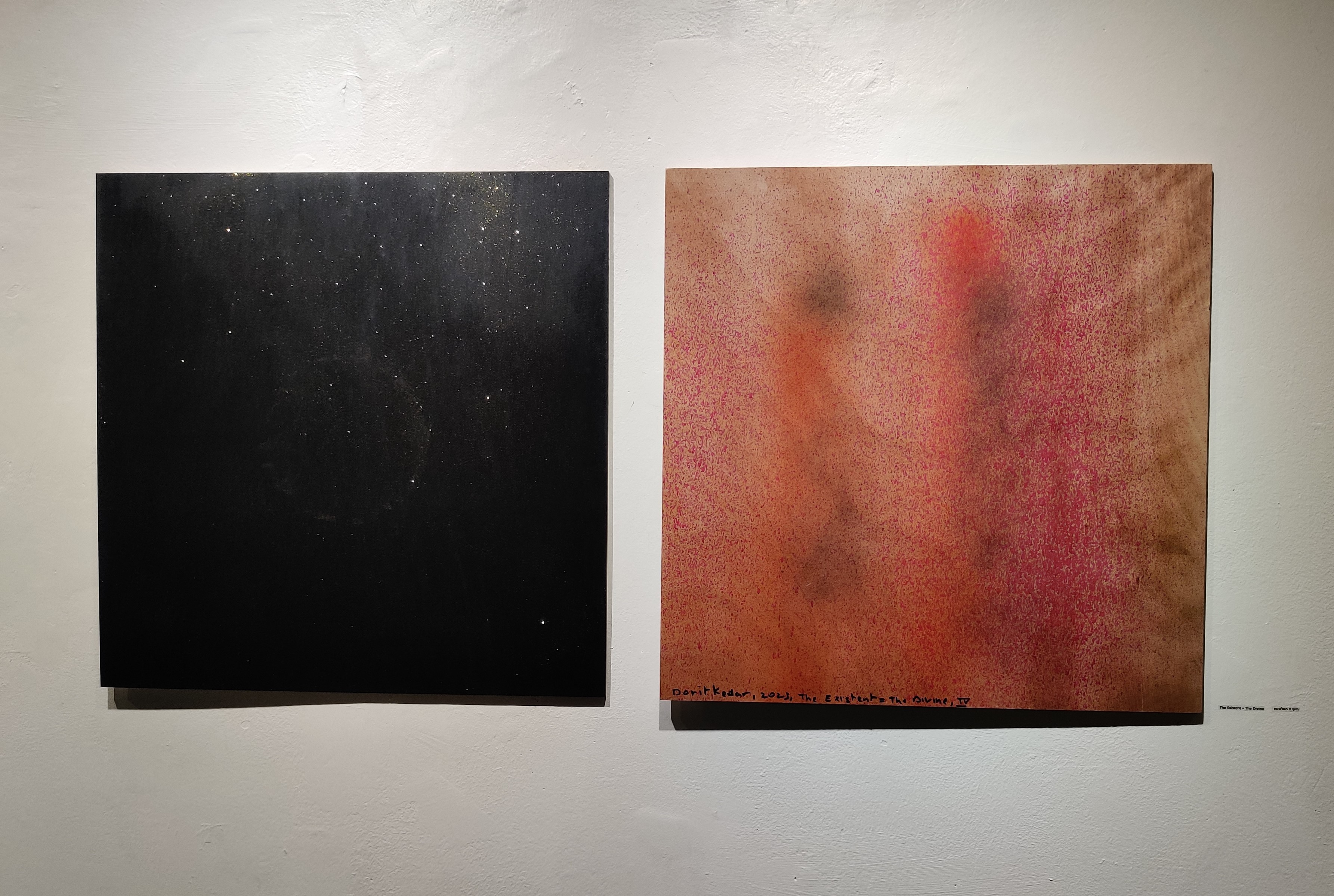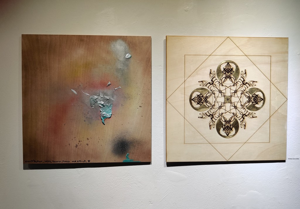 עבודות האמנים בטכניקה מעורבת על מצע עץ, כאשר חטאב מייצג את הפן הפיגורטיבי וקדר את