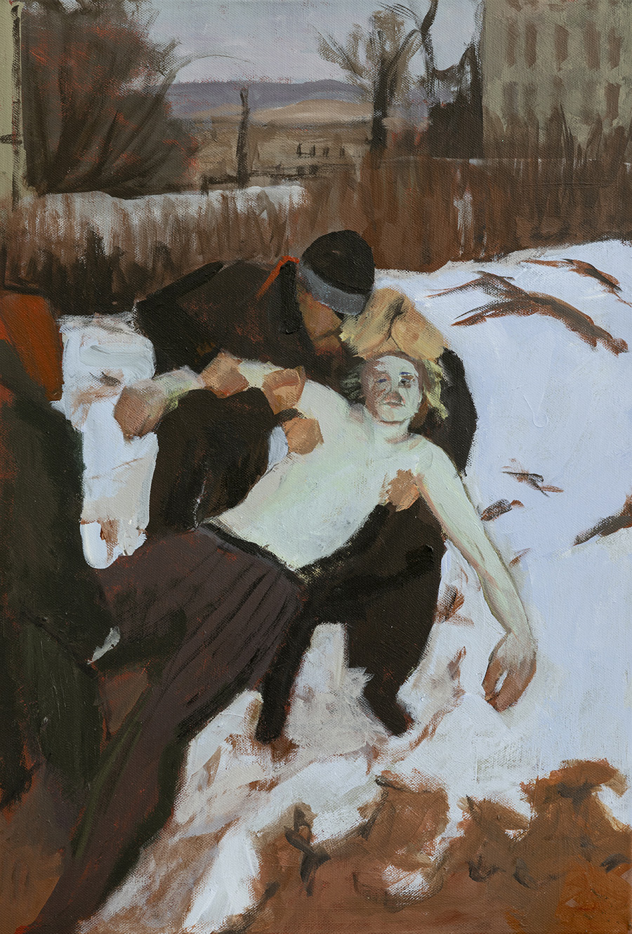 בציור אחר, "חורף עגום" ההתמקדות היא בשתי דמויות, ובעיקר בדמות הגבר המעלה בדעתי ציורי הורדה מן הצלב (ואולי זה הדימיון הפרוע שלי?). יש לציין שבציורים אלה כבשאר העבודות בתערוכה, כל עבודה שונה מרעותה; חלקן נוטות לפיגורציה ויש עבודות בהן הדמויות הן על גבול ההפשטה.