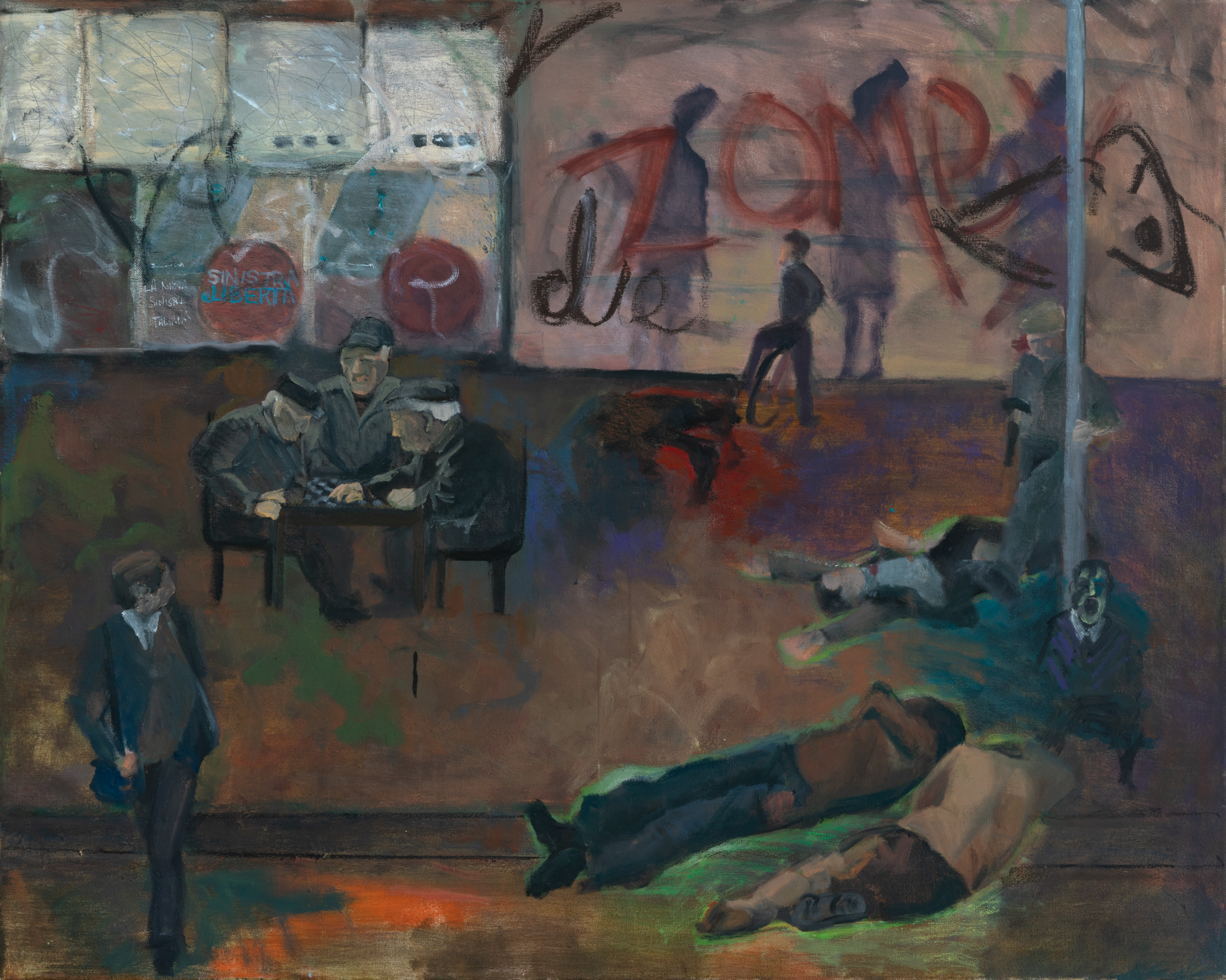עיני, עין הצופה נעה בין עבודות אשר הלייט מוטיב בהן הוא העלילה. בחלק מהן, ניכרות התכתבויות והומאז'ים של האמנית לתולדות האמנות. ב"הדרדרות עירונית" מתרחשות מספר עלילות בה בעת. שלושת הדמויות המשחקות בשש בש, המעלות ברוחי את סצנות המשחקים באשר הן באמנות הנדרלנדית (מאה 17) או אצל פול סזאן, ארנסט לודוויג קירשנר ואחרים, ועבור אל העלמות המצוירות על גבול ההפשטה ונדמות כצלליות על הקיר או כגרפיטי כשלכך מתלווה הכיתוב ZOMBY. העין נעה מהן אל דמות הגבר הדורך על דמות אחרת, ודמות נוספת המאזכרת דמויות של פרנסיס בייקון, הומלסים ועוד. בעבודה זו מציינת אדמס השכבות הן ה-timeline שלה המייצג את "האני".