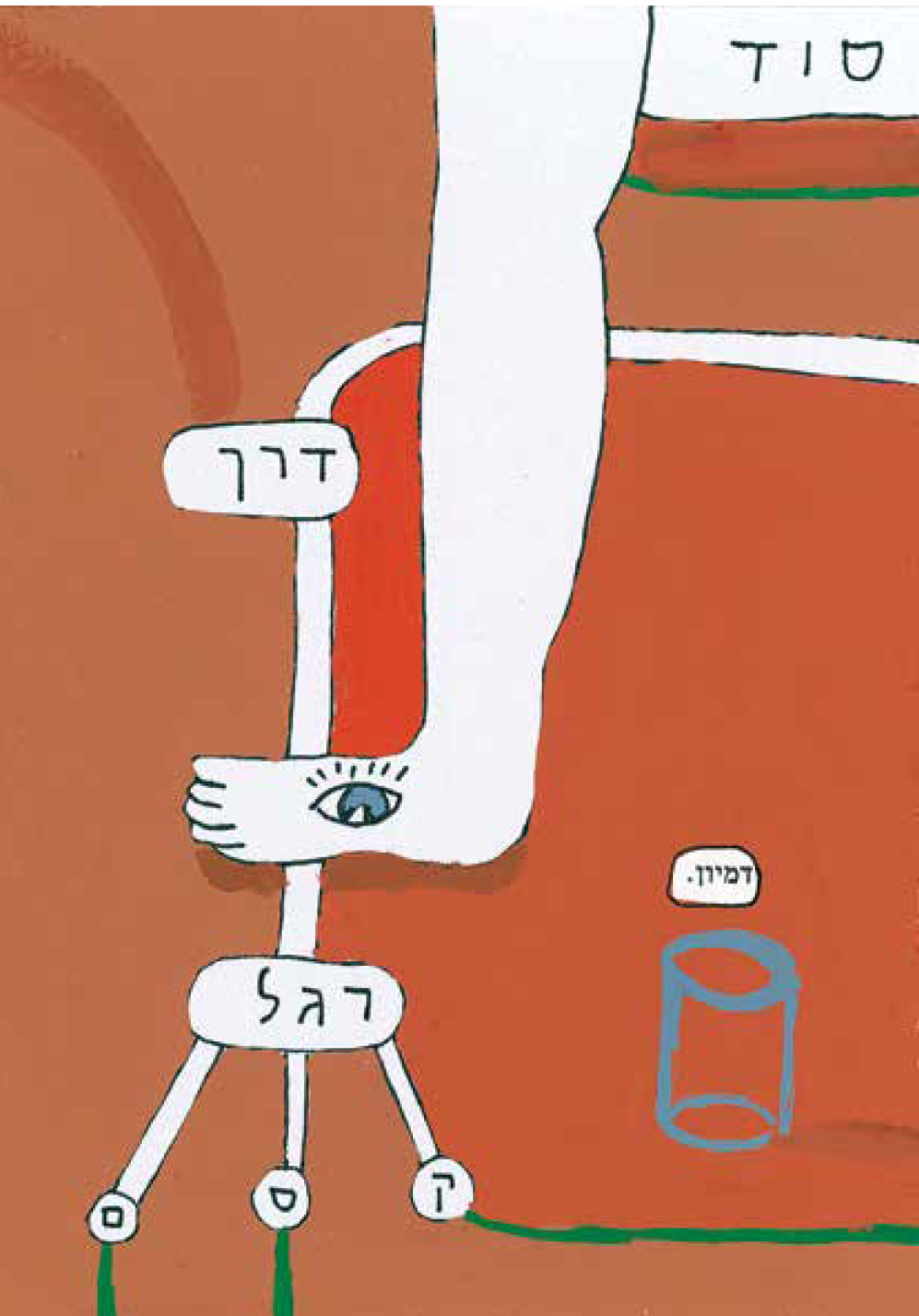 חלק מהדימויים והטקסטים נעים על רצף זרם התודעה בהתייחס למחשבות אסוציאטיביות ללא רצף ליניארי ויש דימויים סוריאליסטיים היברידיים המשלבים לדוגמה, כף רגל עליה מצוירת עין אדם.