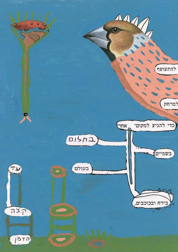 הדימויים בספר צבועים בצבעים עזים ולעתים מרוככים ובחומריות משתנה; צבעי יסוד וצבעים משלימים – צהוב, כחול, אדום, ירוק, סגול ואף ורוד ועוד. טקסט, משפט, ומילה הנלווים כאמור לעיל לדימוי. מילות שירה שזורות המאפשרות לעתים רצף קריאה, ויש ומאתגרות את עין הצופה בבואו לגלות במה מדובר. שְנִיּוּת ותעתועי עין מופיעים אף הם בדימויים שלרגע נדמים לחפץ כלשהו (ספל?) ואזי (אולי?) לצלו המוטל. ובמקום אחר ראש בפרופיל – אדם – מקור של ציפור? ושמא פסל כמו שכתוב למטה…