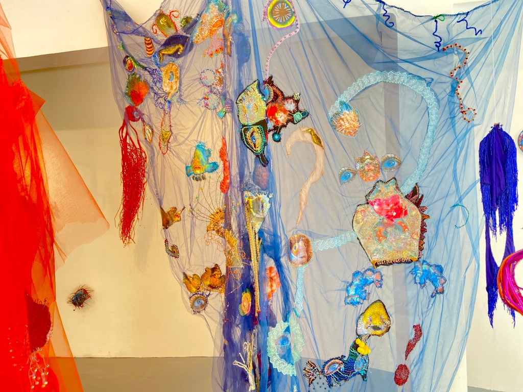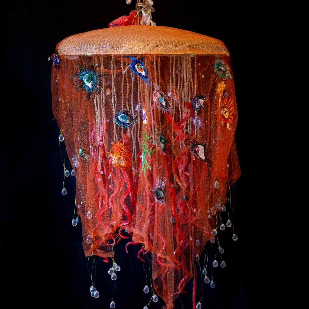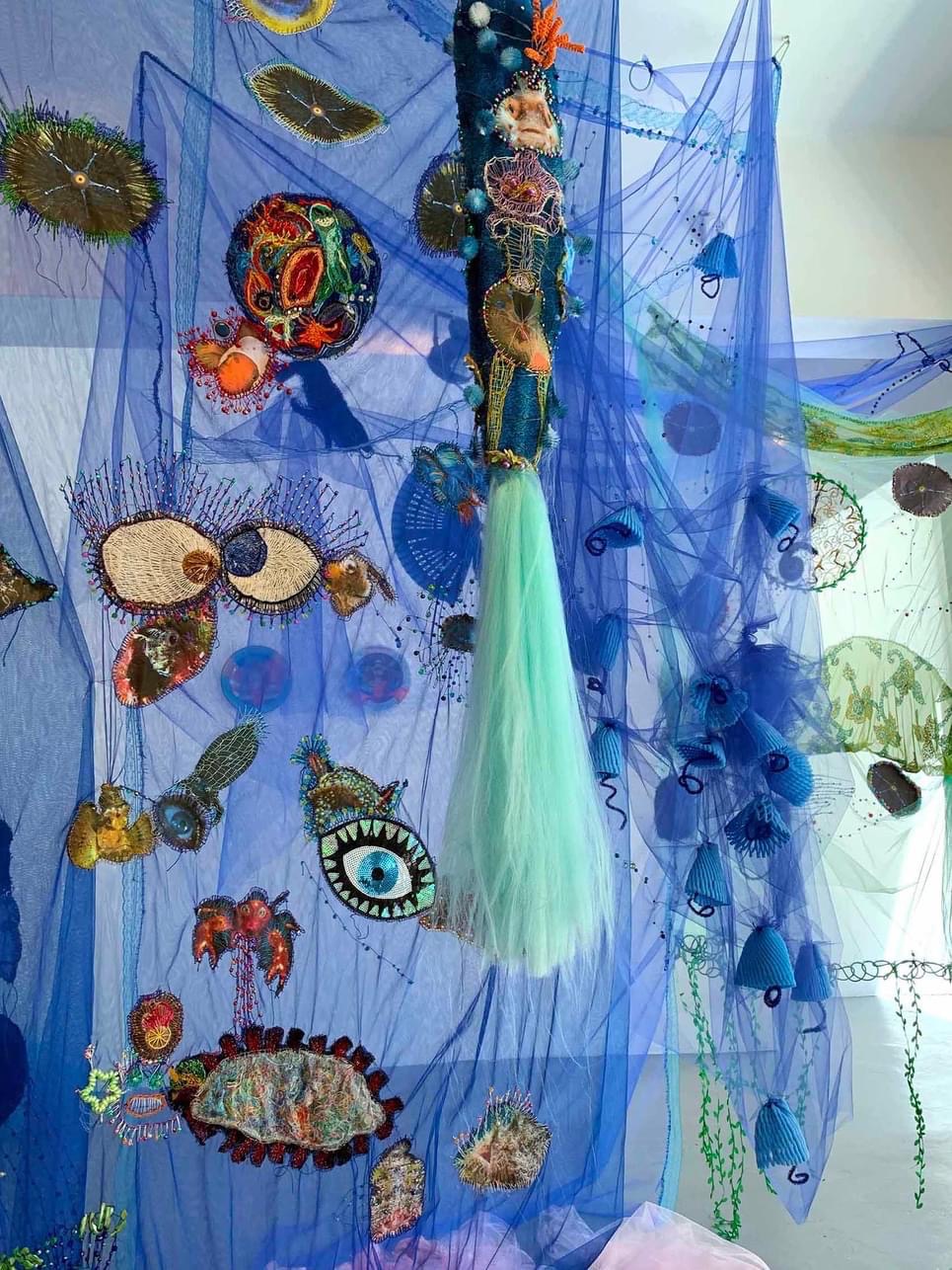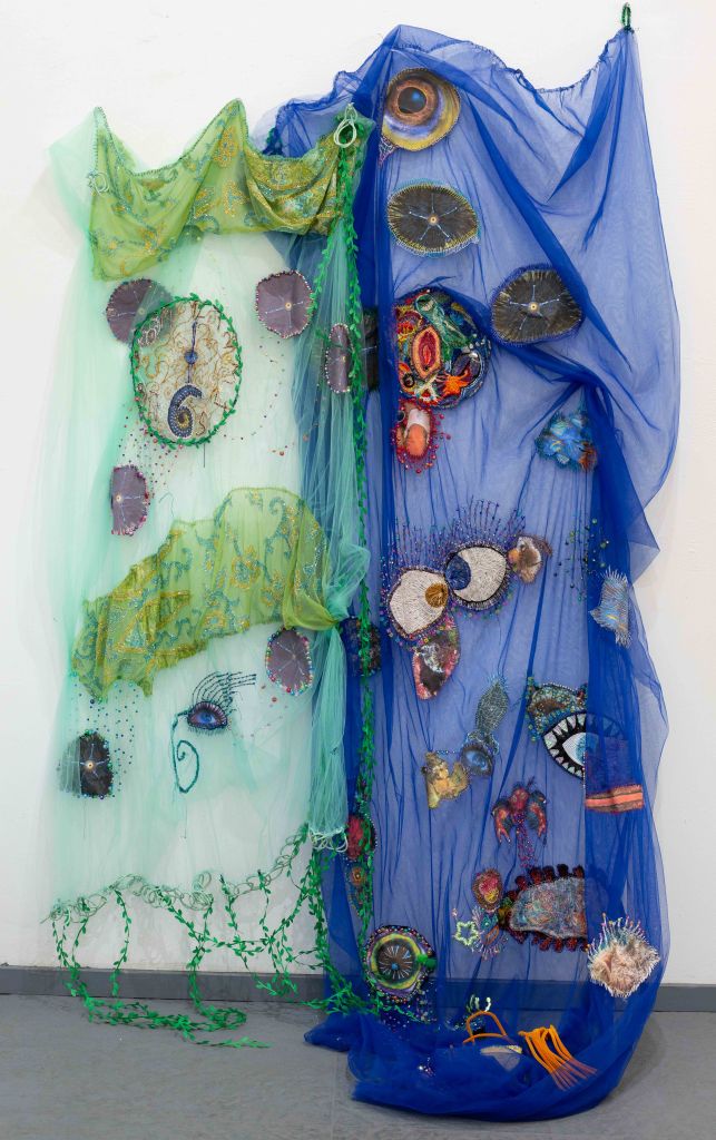 לבאים בשערי התערוכה "העין של אנימה" של האמנית נולי עומר בגלריה פריסקופ, מזומנת הפתעה. בדי טול צבעוניים רקומים ברקמת יד משתלשלים מהרצפה, שלובים בדימויים מעולמות החי, הצומח והדומם. אליהם חוברים דימויי עיניים המביטות בנו הצופים באשר נלך, חלקן מוקפות ברקמות עשירות, אחרות משולבות בתכשיטים. בנוסף, יצורים ימיים – מדוזות, יצורי כילאים (היברידים) ועוד, אותם היא יוצרת מחומרים מן המוכן"- כמניפות, ליפה מן הטבע, ספוגים, ענפים, נייר פצפצים, קסמי שיניים, רקמות וחרוזים צבעוניים. ויש גם "רדי מייד" משולבים – כגון העבודה בה חוברות נעליים לאחד הדימויים, מוצגים על קירות הגלריה או משתלשלים מהתקרה.