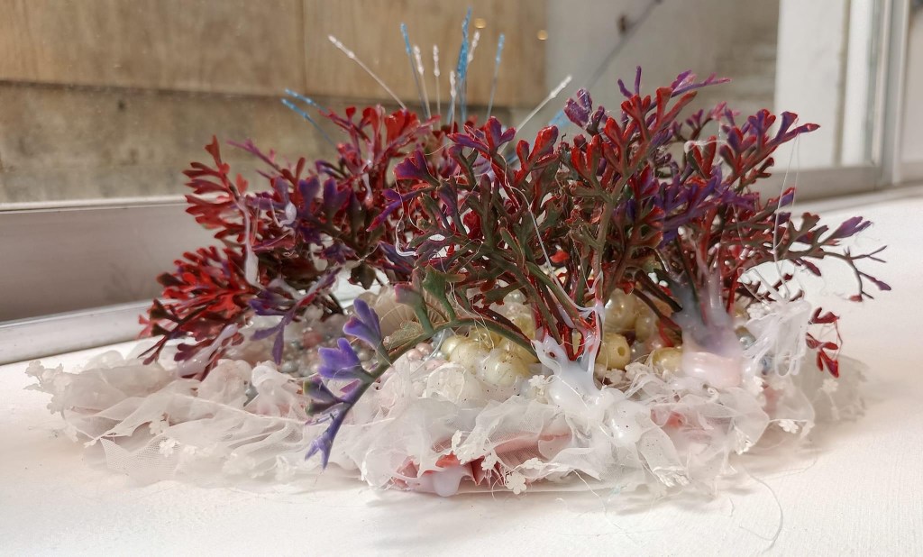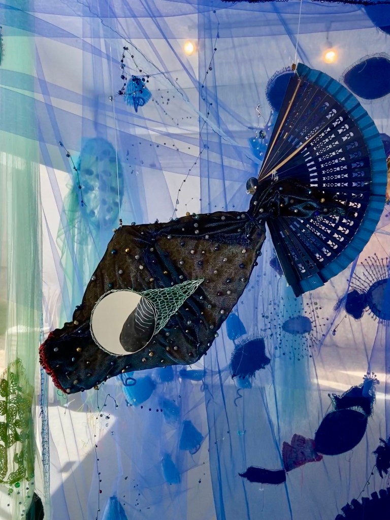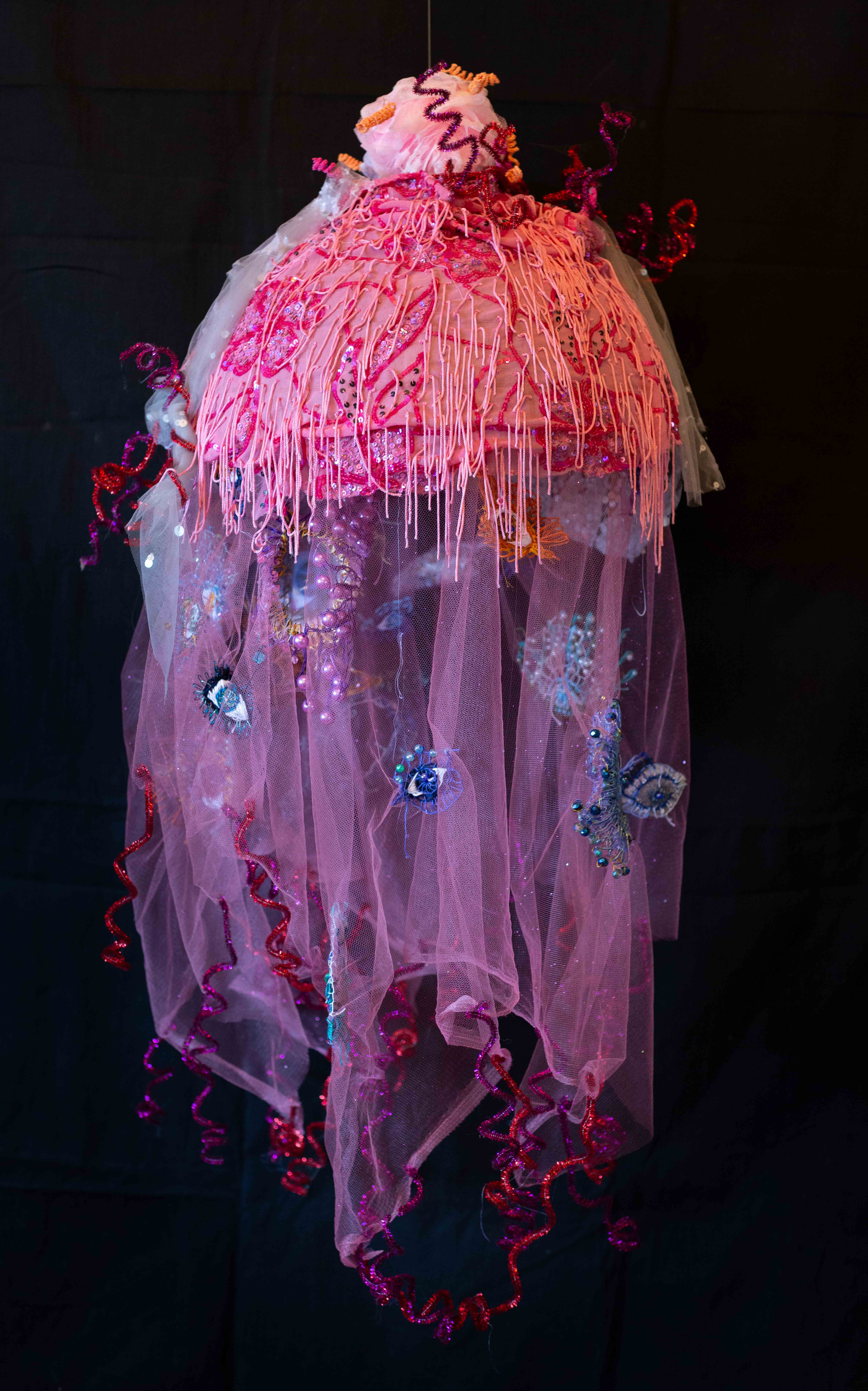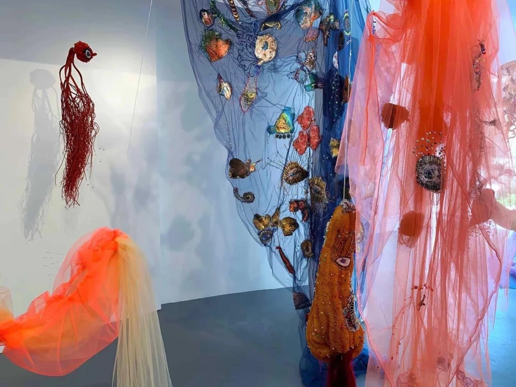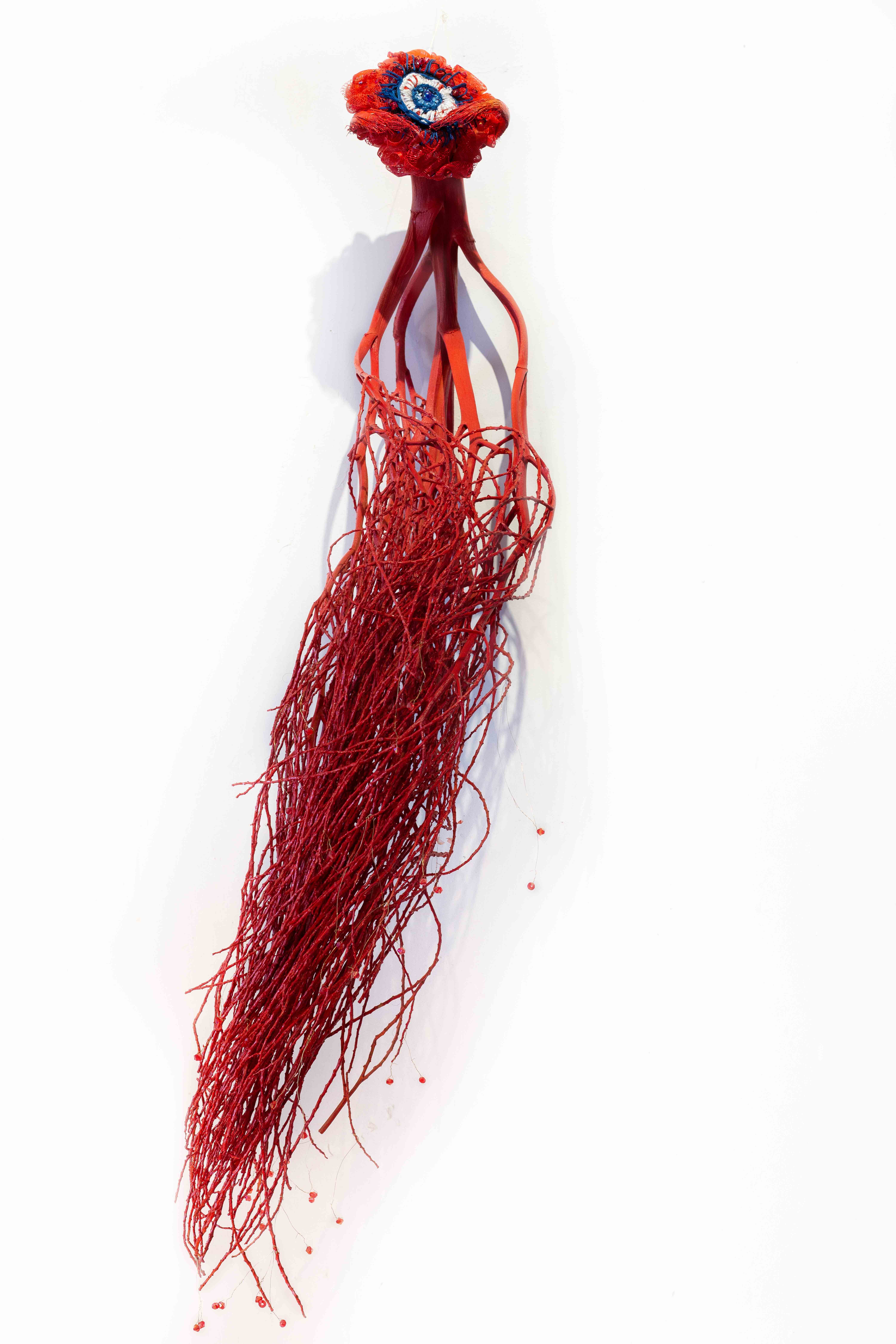 לבאים בשערי התערוכה "העין של אנימה" של האמנית נולי עומר בגלריה פריסקופ, מזומנת הפתעה. בדי טול צבעוניים רקומים ברקמת יד משתלשלים מהרצפה, שלובים בדימויים מעולמות החי, הצומח והדומם. אליהם חוברים דימויי עיניים המביטות בנו הצופים באשר נלך, חלקן מוקפות ברקמות עשירות, אחרות משולבות בתכשיטים. בנוסף, יצורים ימיים – מדוזות, יצורי כילאים (היברידים) ועוד, אותם היא יוצרת מחומרים מן המוכן"- כמניפות, ליפה מן הטבע, ספוגים, ענפים, נייר פצפצים, קסמי שיניים, רקמות וחרוזים צבעוניים. ויש גם "רדי מייד" משולבים – כגון העבודה בה חוברות נעליים לאחד הדימויים, מוצגים על קירות הגלריה או משתלשלים מהתקרה.