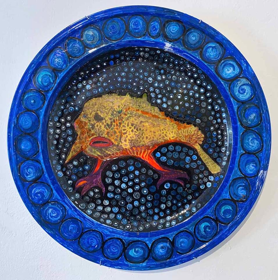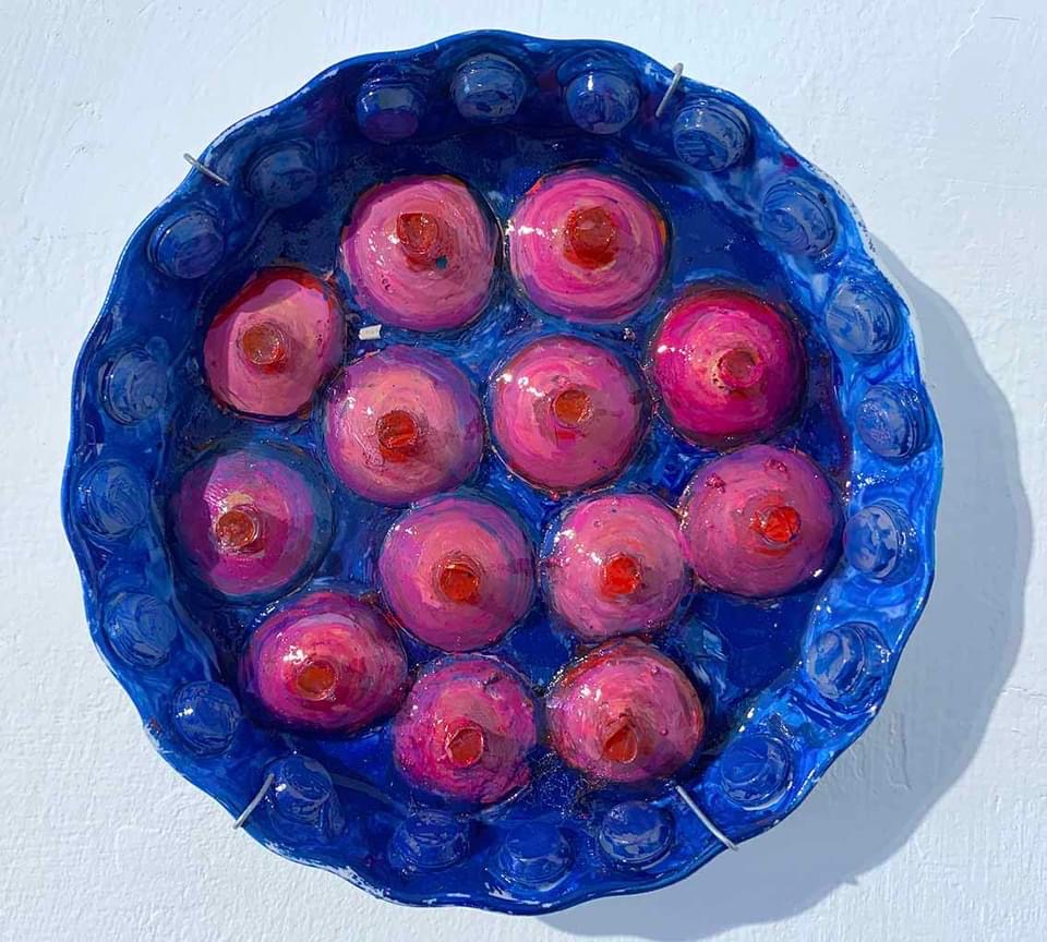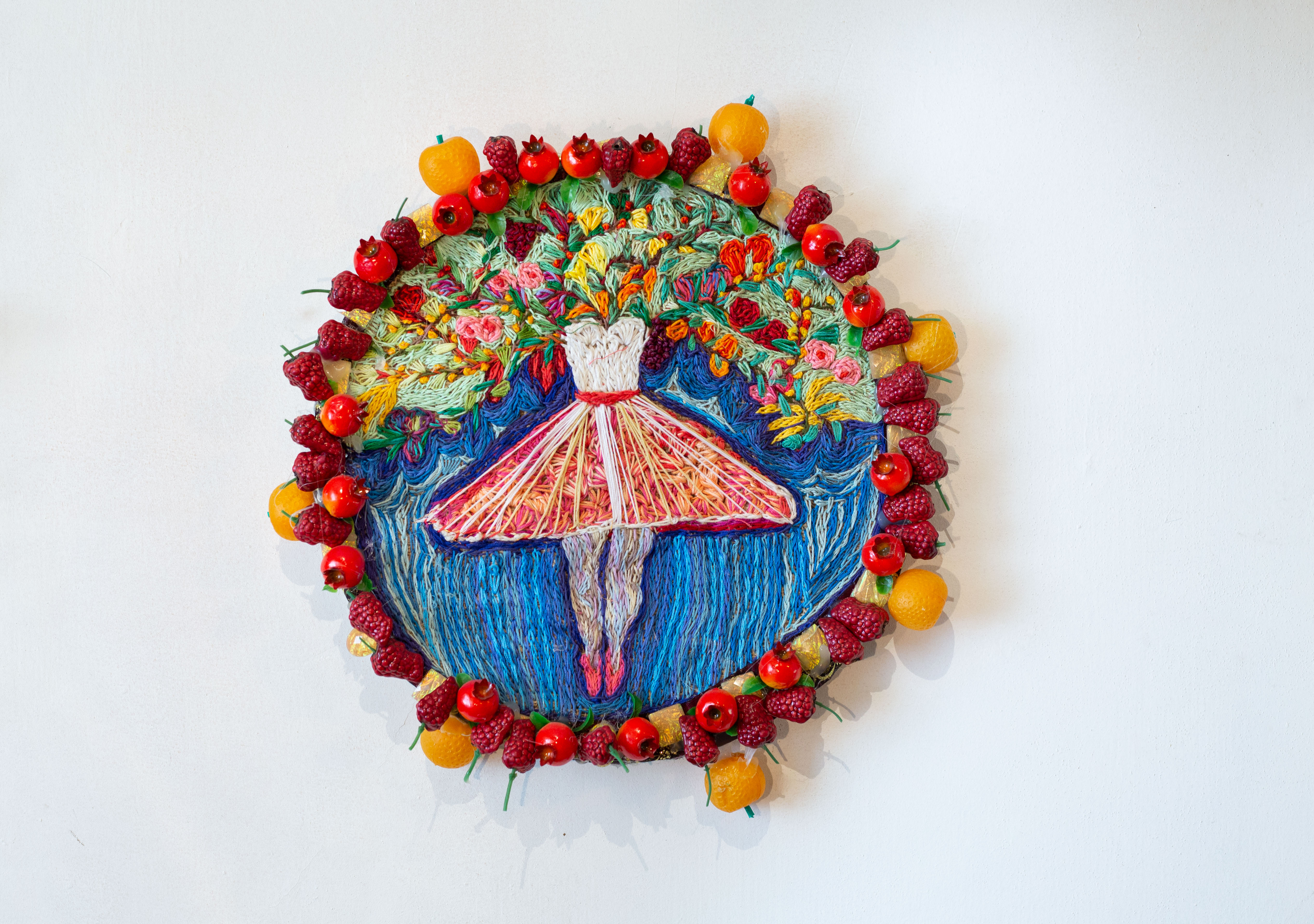 אל עבודה הרקמה בה עסקה בנעוריה, חזרה לפני מספר שנים. והיא כאמור נוכחת בבדי הטול, עומדת בפני עצמה או כמקיפה דימוי עין, חרוזים, נצנצים וכדומה. בנוסף מוצגות בתערוכה צלחות שהן תוצר של מספר חומרים – ציור, צילום פלוס הדבקה.