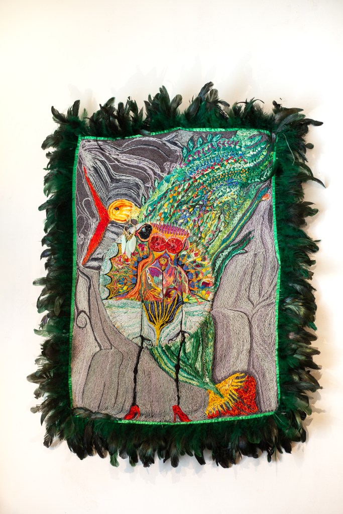 באשר למתודת העבודה – עומר לא מתכננת בד"כ מראש, אלא עובדת באופן אינטואיטיבי. הפעם נתנה לעצמה "לזרום" עם צורות וחומרים. צילום, רקמה. סטריפים, חרוזים, דמעה מזכוכית. שילוב של מספר מדיה שביחד יוצרים דימוי אחד.