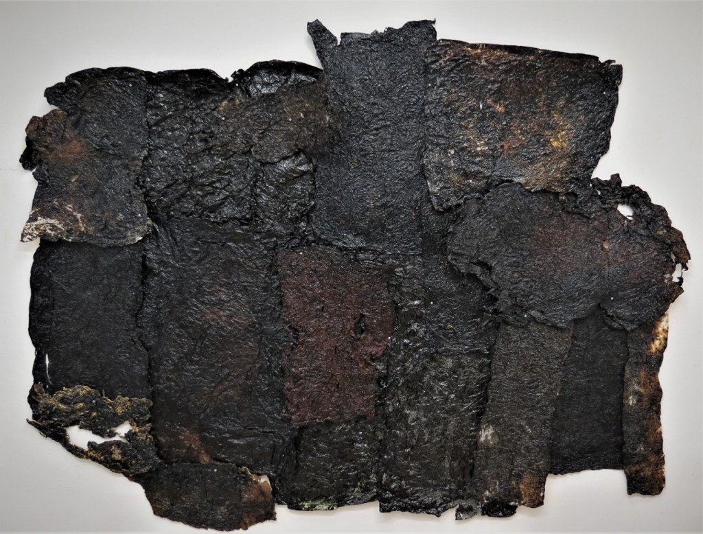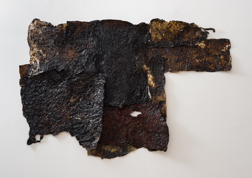 יריעת טלאים המורכבת מניירות משי טבולים בזפת, נראית כמגילה שנמחקה או שעתידה להיכתב.
